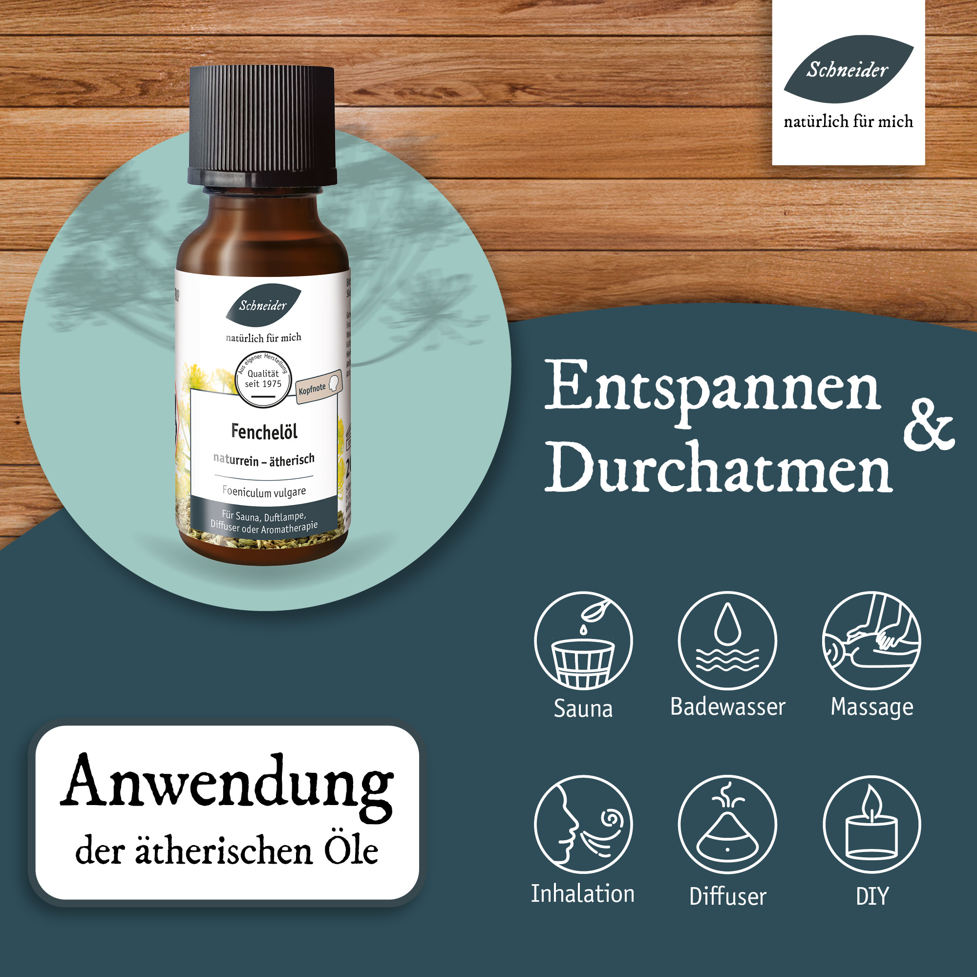 Anwendung: wenige Tropfen in Massageöl, in das Badewasser oder die Duftlampe, besonders beliebt in der Sauna