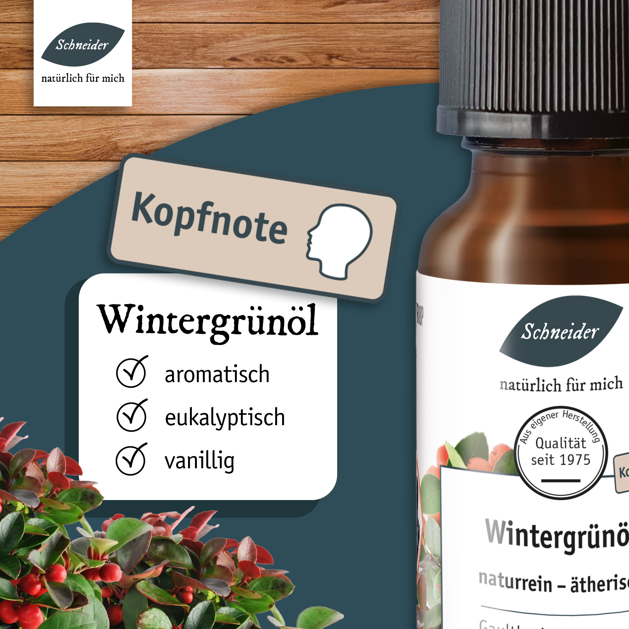 Name, botanischer Name: Wintergrün; Gaultheriae aetheroleum