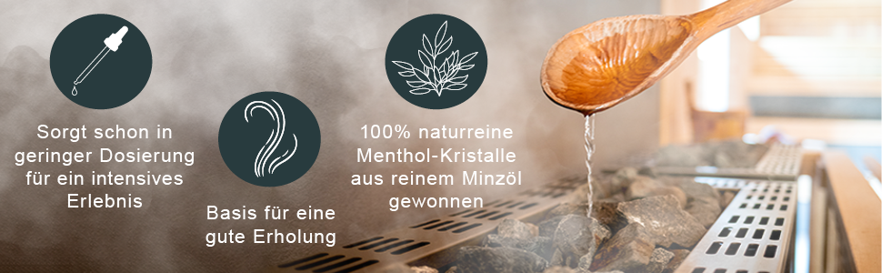 Dosierung - zur Anwendung als Saunaaufgussmittel: Je nach Saunagröße unterschiedlich und sparsam dosieren. Starten Sie zunächst mit einem Mentholkristall. Erhöhen Sie die Dosis nach Belieben, um die Intensität zu steigern. Wir empfehlen die Kristalle in warmen Wasser zu lösen und dann aufzugießen oder mittig in Eis-Balls zu positionieren und auf die Saunasteine zu legen. Nicht pur auf die Steine geben, dies kann zu Verpuffungen führen!