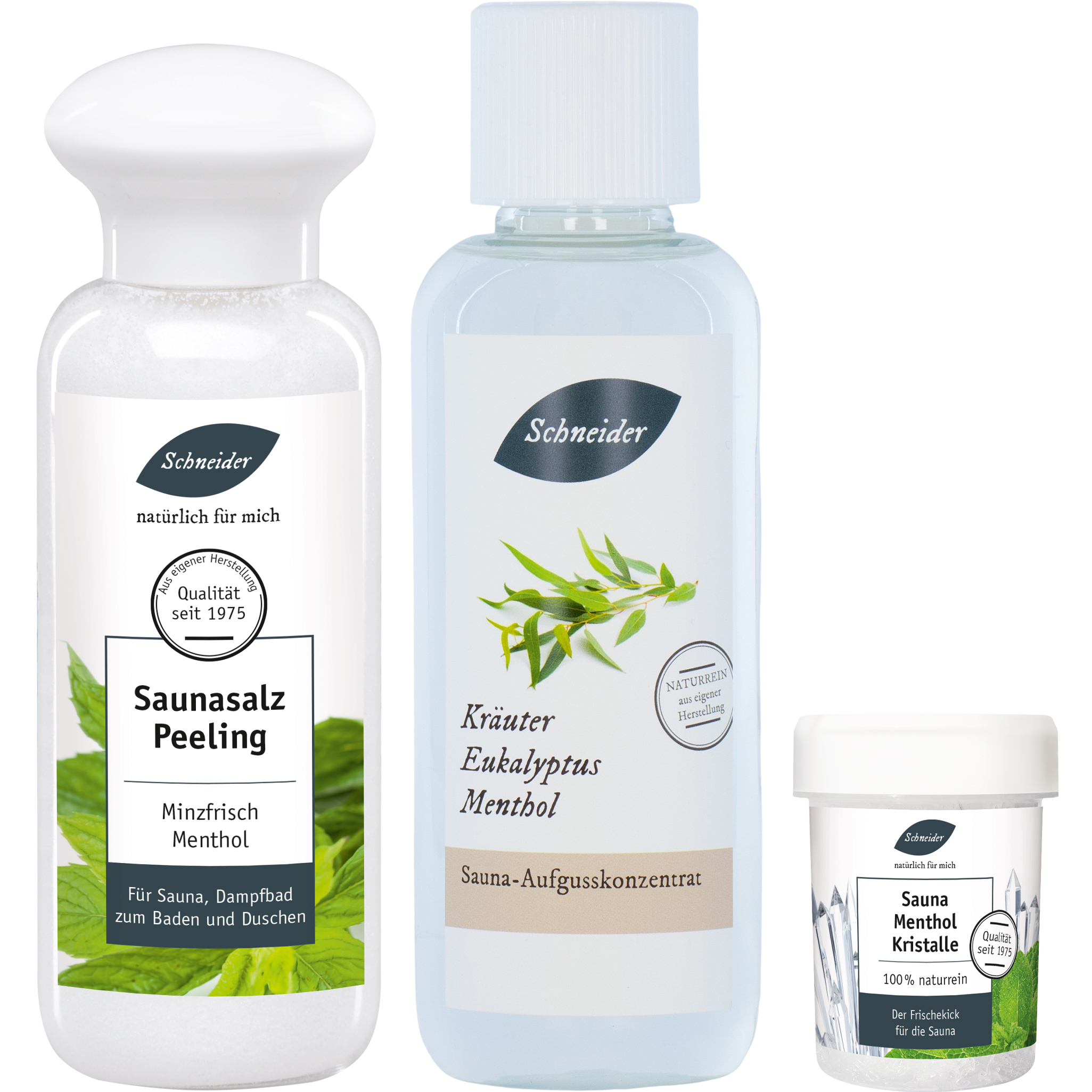 20 g Menthol Kristalle, 250 ml Aufguss, 300 g Saunasalz Peeling