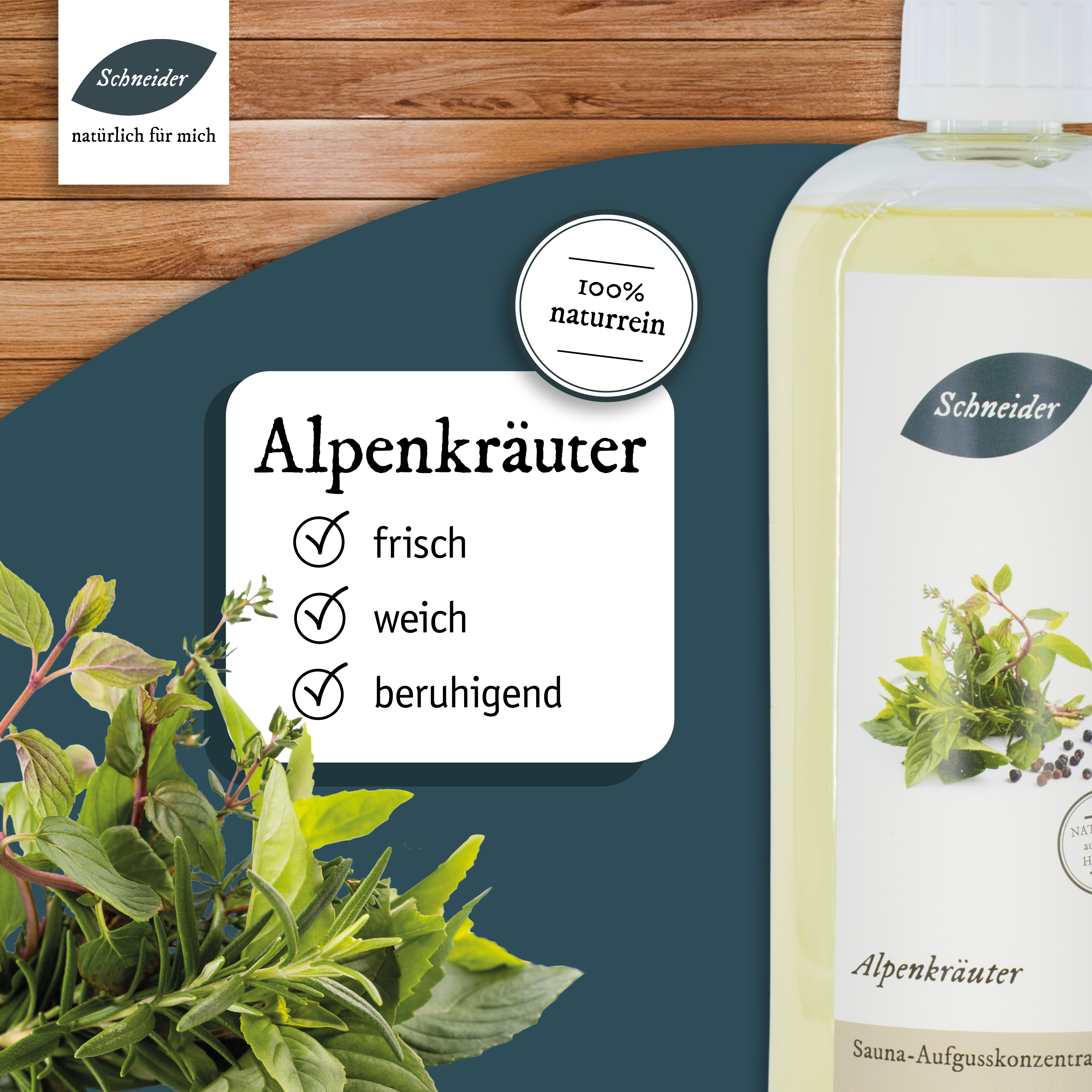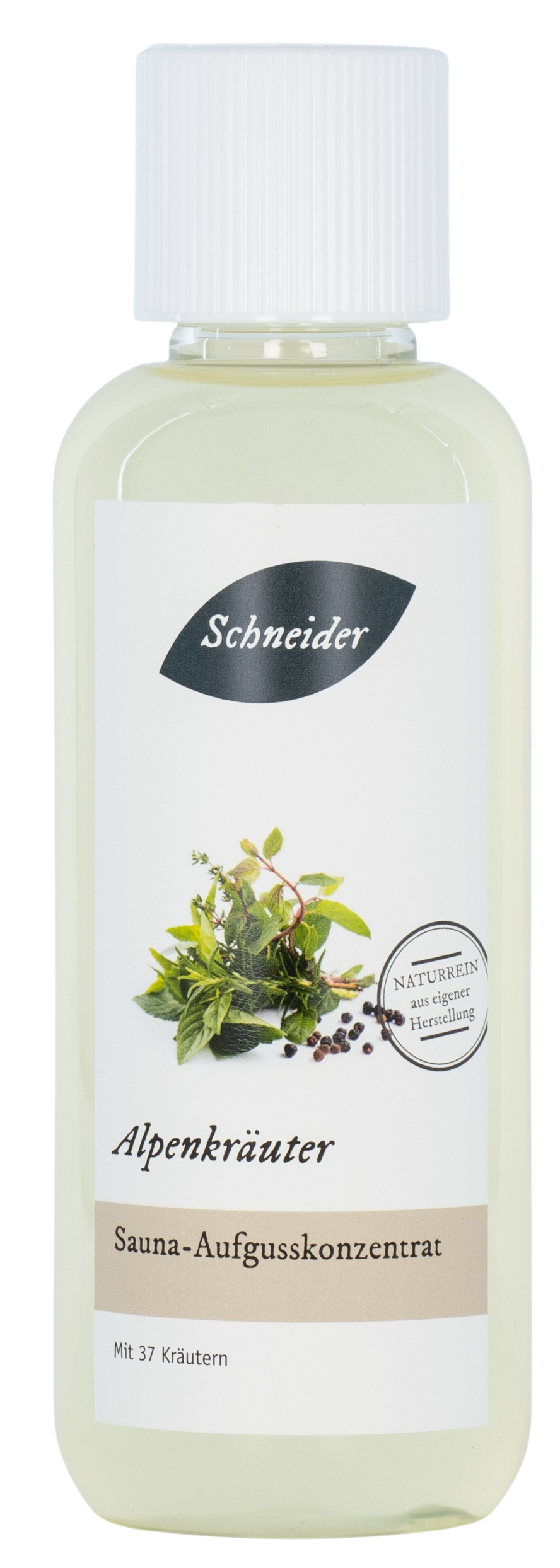 Alpenkräuter: kraftvoller, vielfältiger Saunaaufguss mit verschiedenen Alpenkräutern; aus natürlichen Ölen und eigener Herstellung