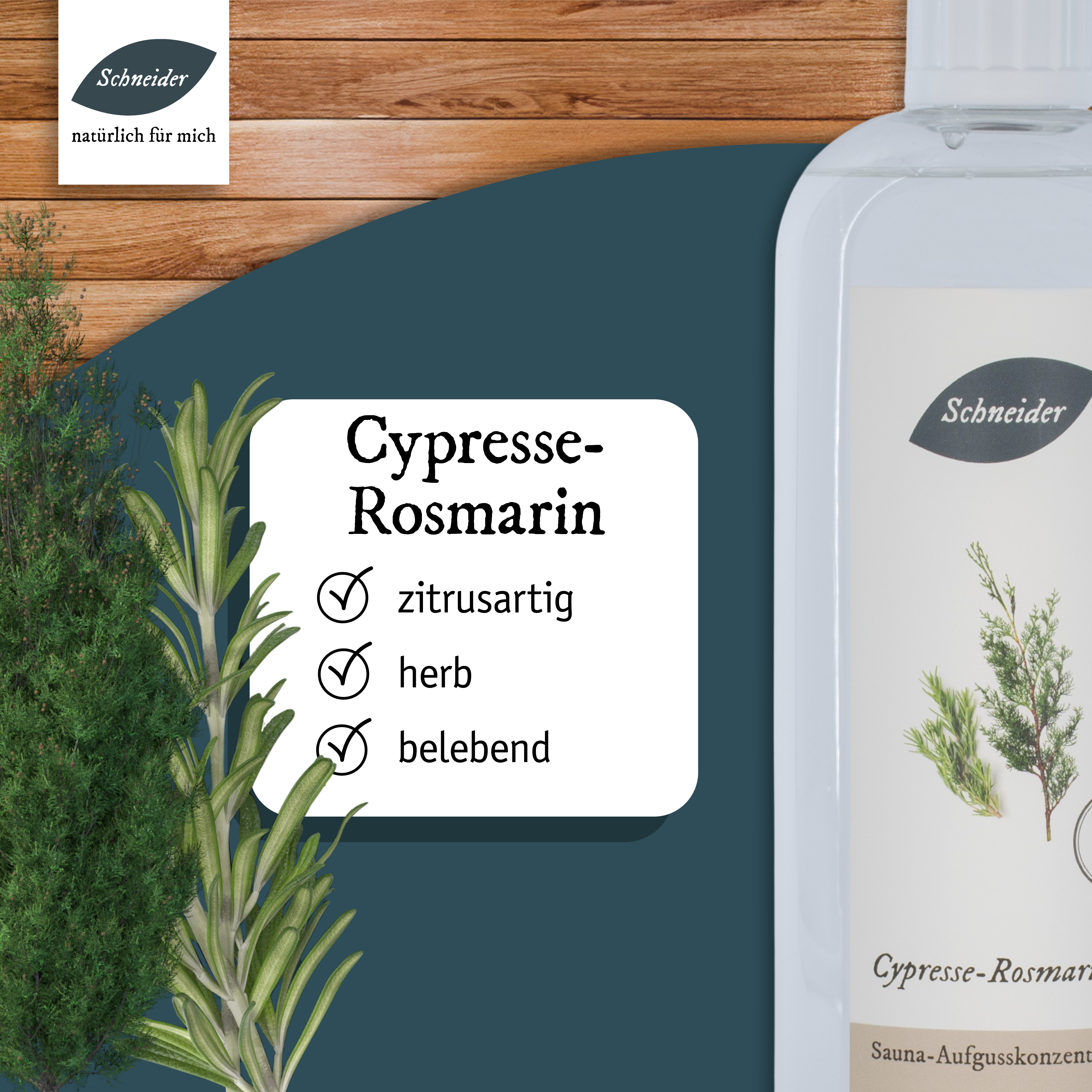 Eigenschaften "Saunaaufguss Cypresse-Rosmarin (Aufgusskonzentrat) 250 ml"