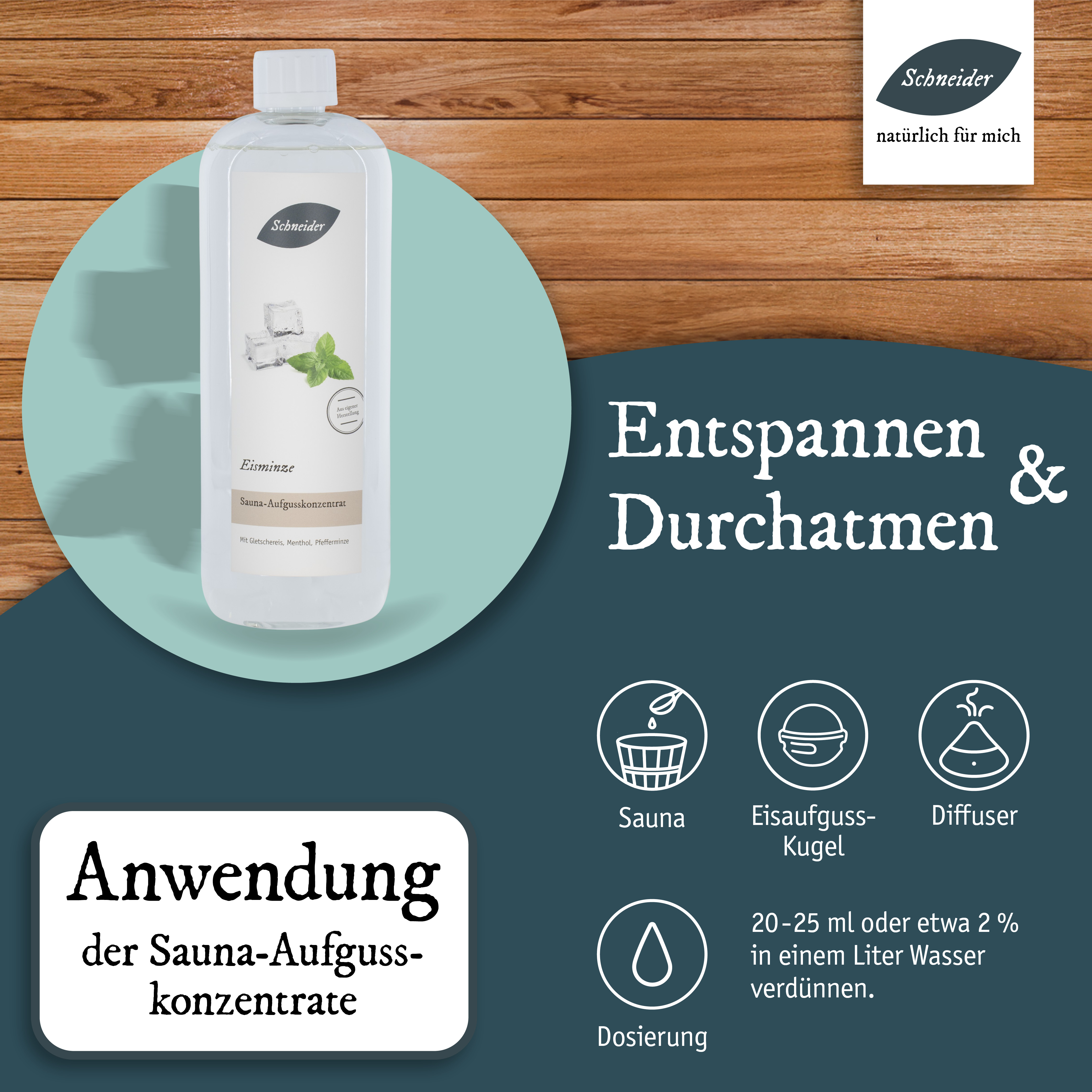 Für alle Eisbonbon-Liebhaber ist hier der passende Saunaaufguss! Neben dem typischen Gletschereis-Aroma begeistert der Saunaaufguss Eis-Minze mit seinem frischen, grünen und kühlenden Duft. Schalten Sie ab und genießen Sie die Klarheit und Reinheit des nach eigener Rezeptur hergestellten Sauna-Aufgusses. Anwendung: Die Dosierung der Aufgüsse kann abhängig sein von der Größe der Sauna, der Leistung der Heizelemente, den Vorlieben der Anwender und der Intensität der einzelnen Inhaltsstoffe (wie ätherischen Ölen, Ölgemischen oder Duftölen). Als Richtwert empfehlen wir ein bis zwei Esslöffel voll Aufgusskonzentrat oder 20 bis 25 ml Aufgusskonzentrat pro Liter Aufgusswasser. Je nach Belieben können Sie die Dosierung anpassen. Saunaaufgusskonzentrate sind sparsam zu verwenden und sollten nie pur auf die Aufgusssteine oder Heizelemente gegeben werden.
