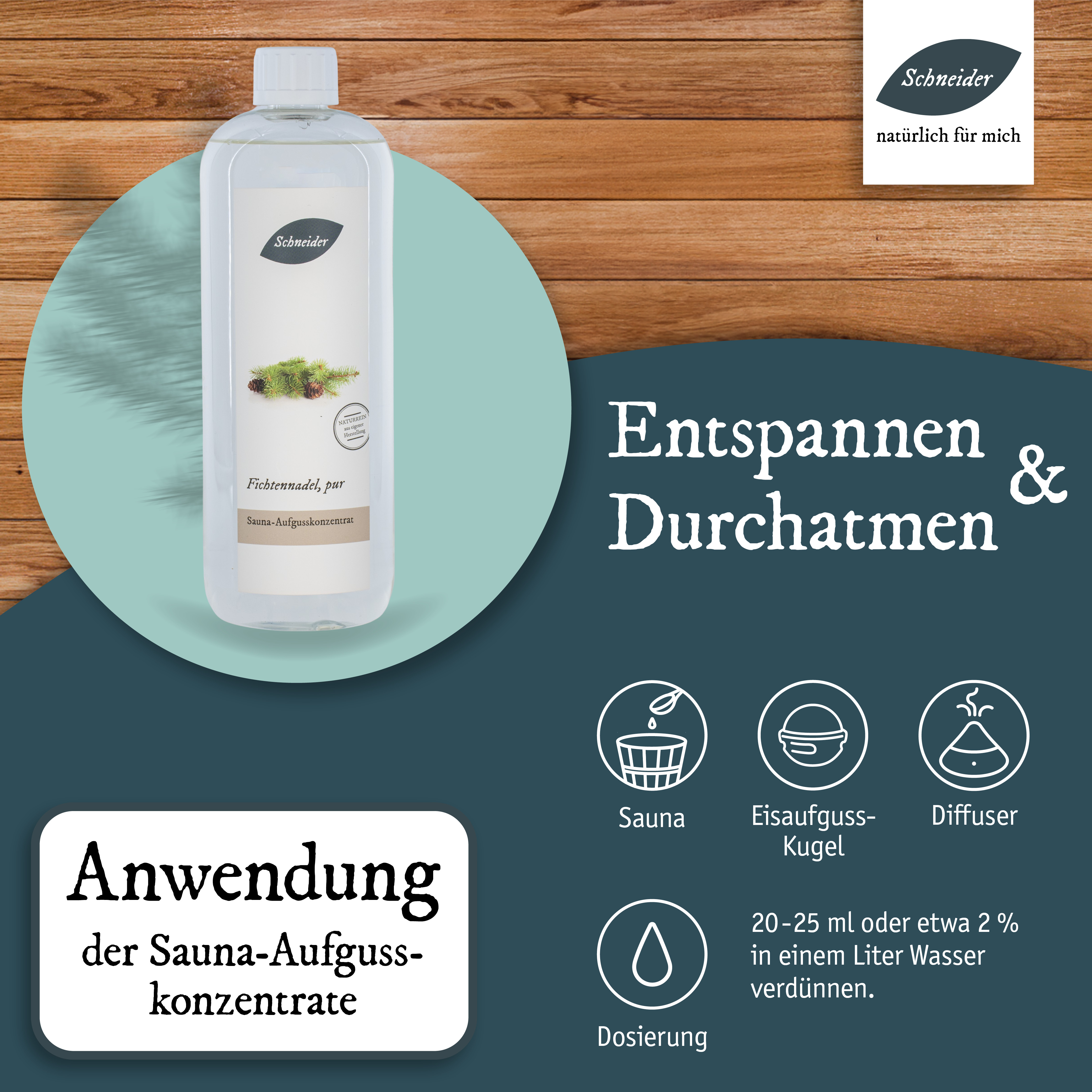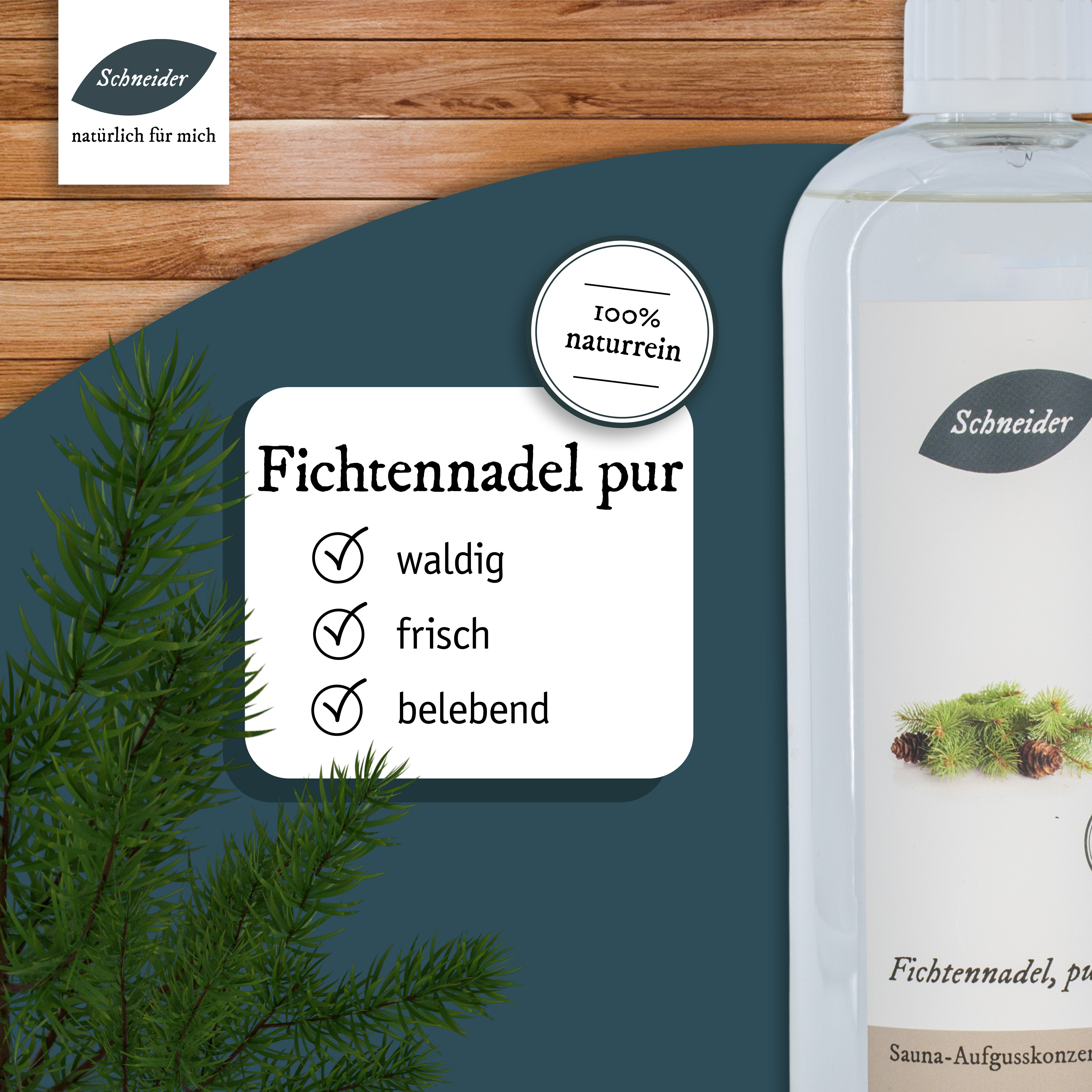 Fichtennadel pur: waldig-frischer Saunaaufguss aus naturreinem Fichtennadelöl und eigener Herstellung