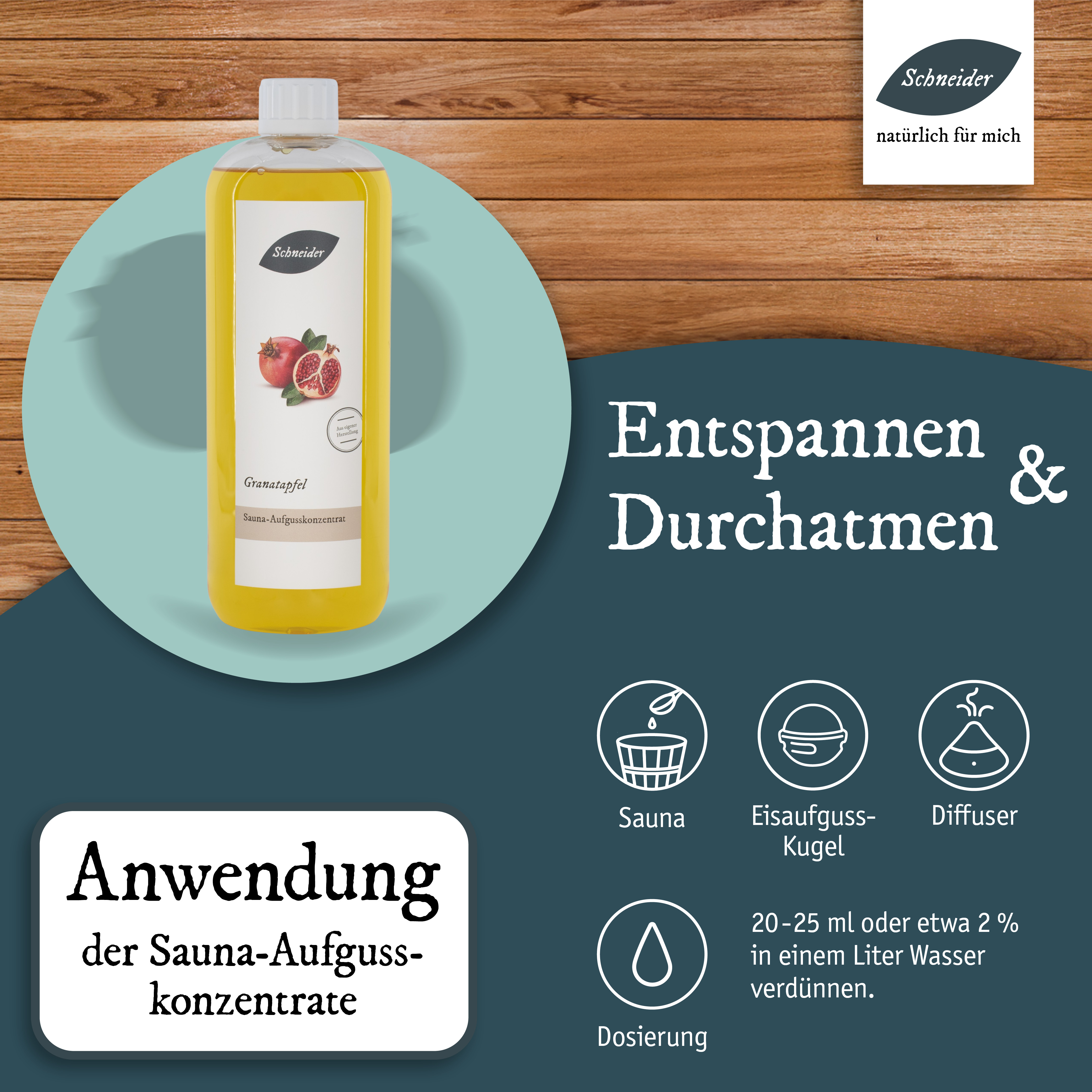 Tauchen Sie ein in die süßlich-fruchtigen Noten von Granatäpfeln. Träumen Sie von den vollen Granatapfelbäumen und spüren Sie die Kraft der Sonne, die in jeder einzelnen Frucht gespeichert ist. Der nach eigener Rezeptur hergestellte Saunaaufguss Granatapfel begeistert mit seiner feinen, orientalisch anmutenden Art und sorgt für pure Entspannung! Anwendung: Die Dosierung der Aufgüsse kann abhängig sein von der Größe der Sauna, der Leistung der Heizelemente, den Vorlieben der Anwender und der Intensität der einzelnen Inhaltsstoffe (wie ätherischen Ölen, Ölgemischen oder Duftölen). Als Richtwert empfehlen wir ein bis zwei Esslöffel voll Aufgusskonzentrat oder 20 bis 25 ml Aufgusskonzentrat pro Liter Aufgusswasser. Je nach Belieben können Sie die Dosierung anpassen. Saunaaufgusskonzentrate sind sparsam zu verwenden und sollten nie pur auf die Aufgusssteine oder Heizelemente gegeben werden.