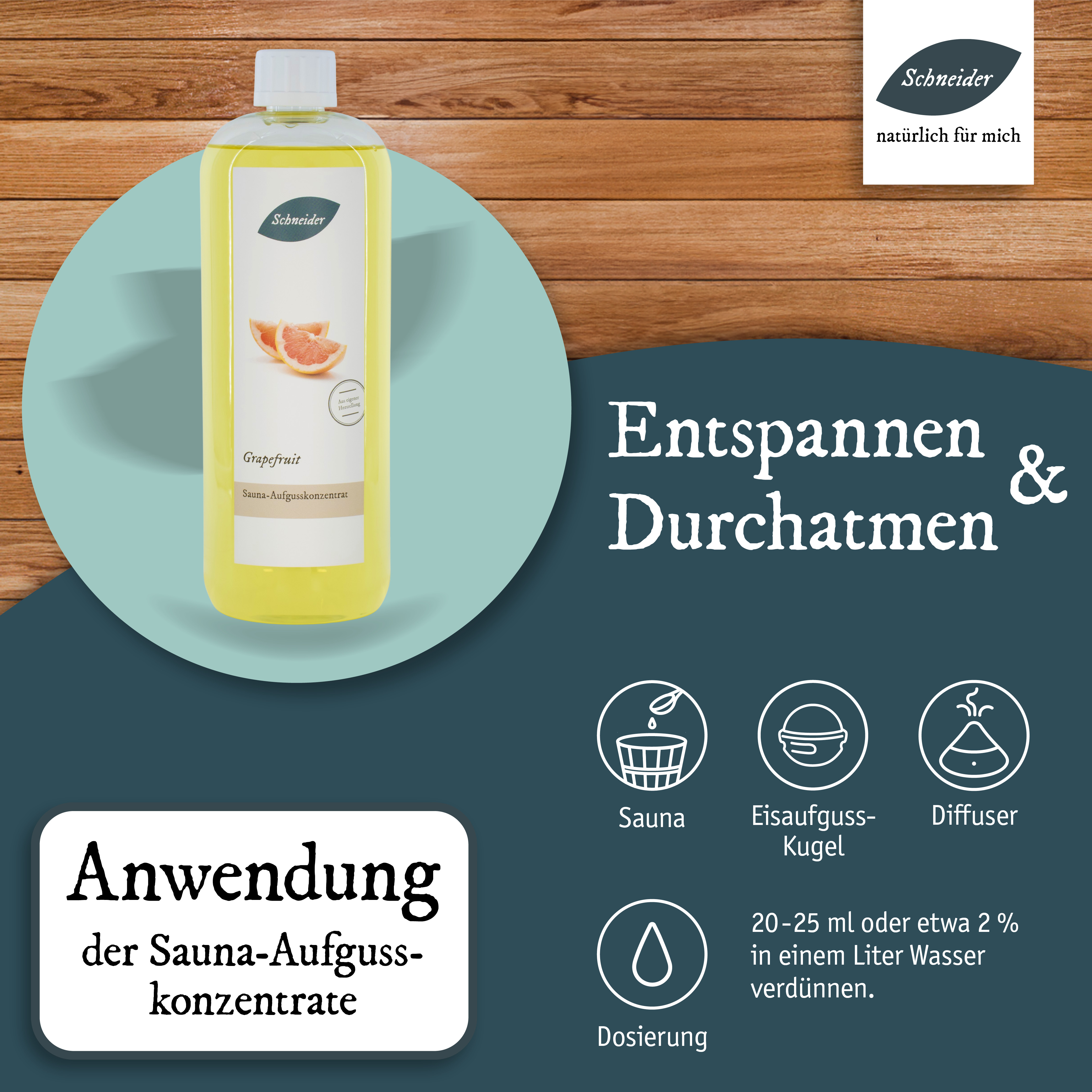 Der süßlich-herbe Duft des nach eigener Rezeptur hergestellten Saunaaufgusses Grapefruit wärmt und harmonisiert Körper und Seele. Lassen Sie sich vom angenehmen Grapefruitduft verführen und spüren Sie, wie dieser die Leichtigkeit in Ihnen zu Tage befördert. Anwendung: Die Dosierung der Aufgüsse kann abhängig sein von der Größe der Sauna, der Leistung der Heizelemente, den Vorlieben der Anwender und der Intensität der einzelnen Inhaltsstoffe (wie ätherischen Ölen, Ölgemischen oder Duftölen). Als Richtwert empfehlen wir ein bis zwei Esslöffel voll Aufgusskonzentrat oder 20 bis 25 ml Aufgusskonzentrat pro Liter Aufgusswasser. Je nach Belieben können Sie die Dosierung anpassen. Saunaaufgusskonzentrate sind sparsam zu verwenden und sollten nie pur auf die Aufgusssteine oder Heizelemente gegeben werden.