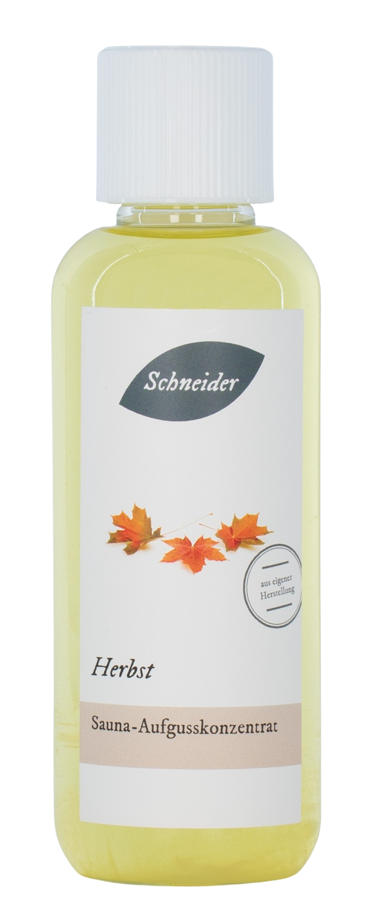 Herbst – das Zusammenspiel von Aromen und Farben! Dieses spiegelt sich auch in dem nach eigener Rezeptur hergestellten Saunaaufguss Herbst wider. Da gibt es die fruchtig-frische Komponente von Orangen, Zitronen und Bergamotte, untermalt von blumigen Noten von Geranium und abgerundet von der warmen, erdig-harzigen Art von Zedernholz. Alles fügt sich zu einem runden Ganzen zusammen – für eine perfekte Erholung! Anwendung: Die Dosierung der Aufgüsse kann abhängig sein von der Größe der Sauna, der Leistung der Heizelemente, den Vorlieben der Anwender und der Intensität der einzelnen Inhaltsstoffe (wie ätherischen Ölen, Ölgemischen oder Duftölen). Als Richtwert empfehlen wir ein bis zwei Esslöffel voll Aufgusskonzentrat oder 20 bis 25 ml Aufgusskonzentrat pro Liter Aufgusswasser. Je nach Belieben können Sie die Dosierung anpassen. Saunaaufgusskonzentrate sind sparsam zu verwenden und sollten nie pur auf die Aufgusssteine oder Heizelemente gegeben werden.