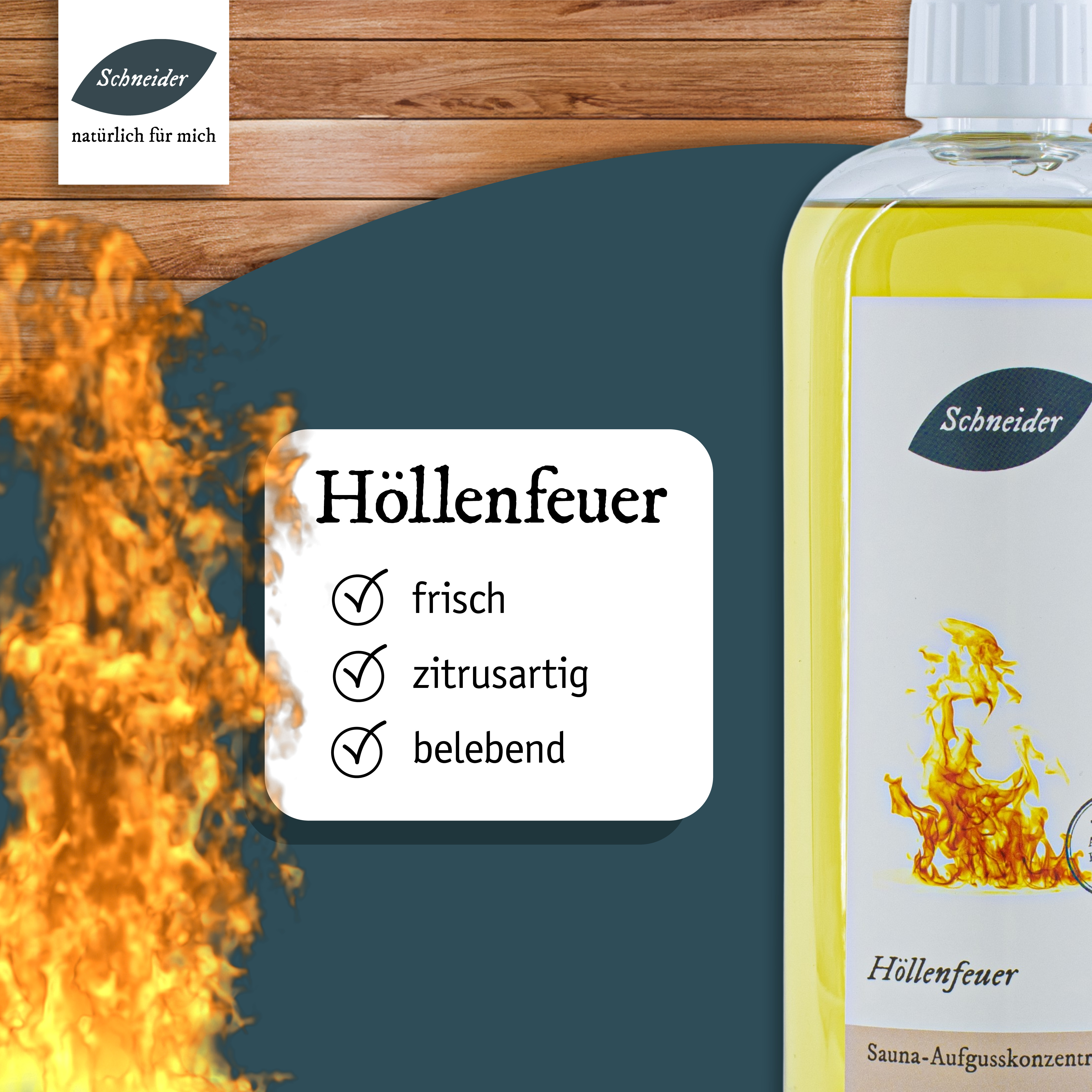 Höllenfeuer: schweißtreibender, feuriger Saunaaufguss aus eigener Herstellung mit Zitrone, Myrte, Zedernholz, Eukalyptus, japanischem Pfefferminzöl, Wachholderbeere und Birke