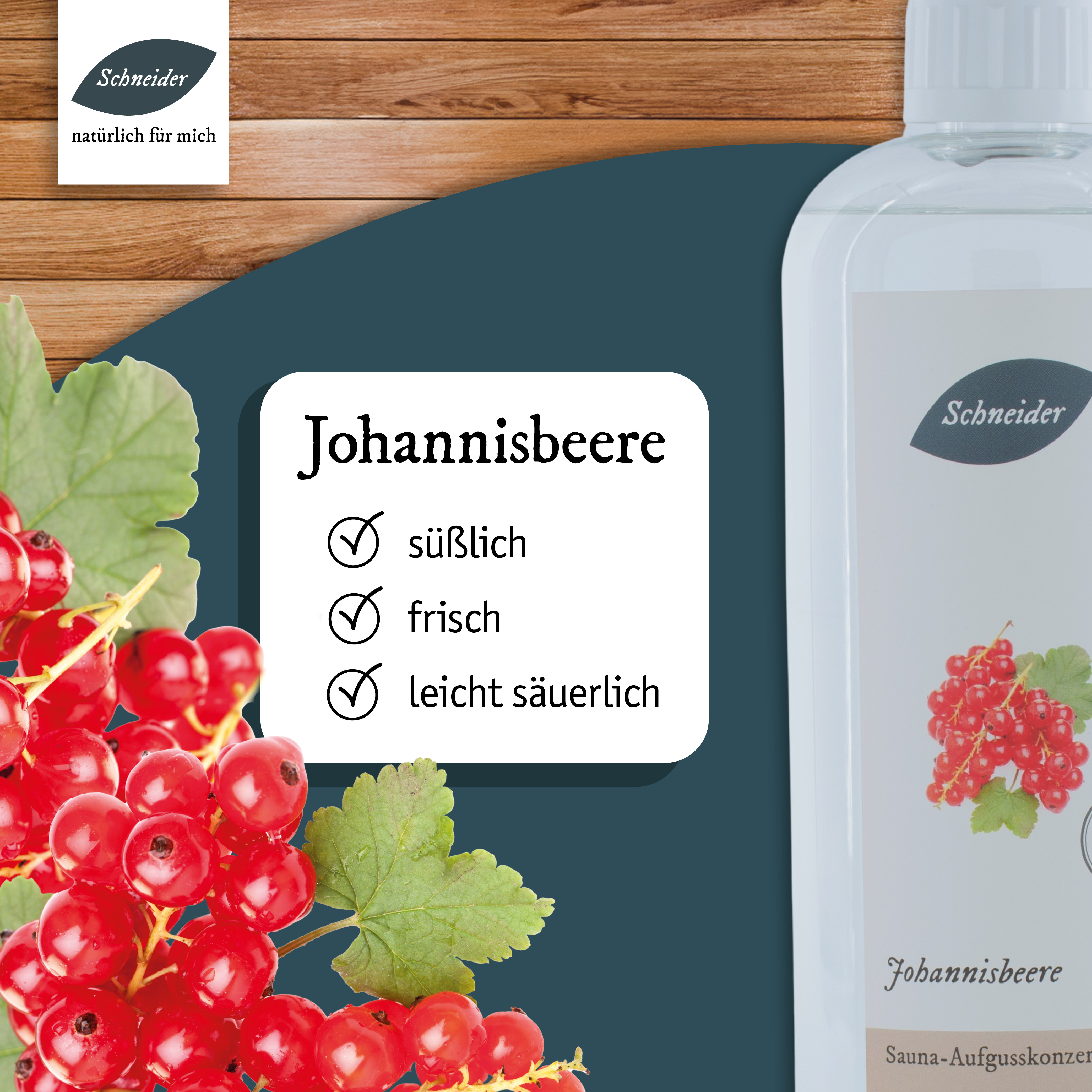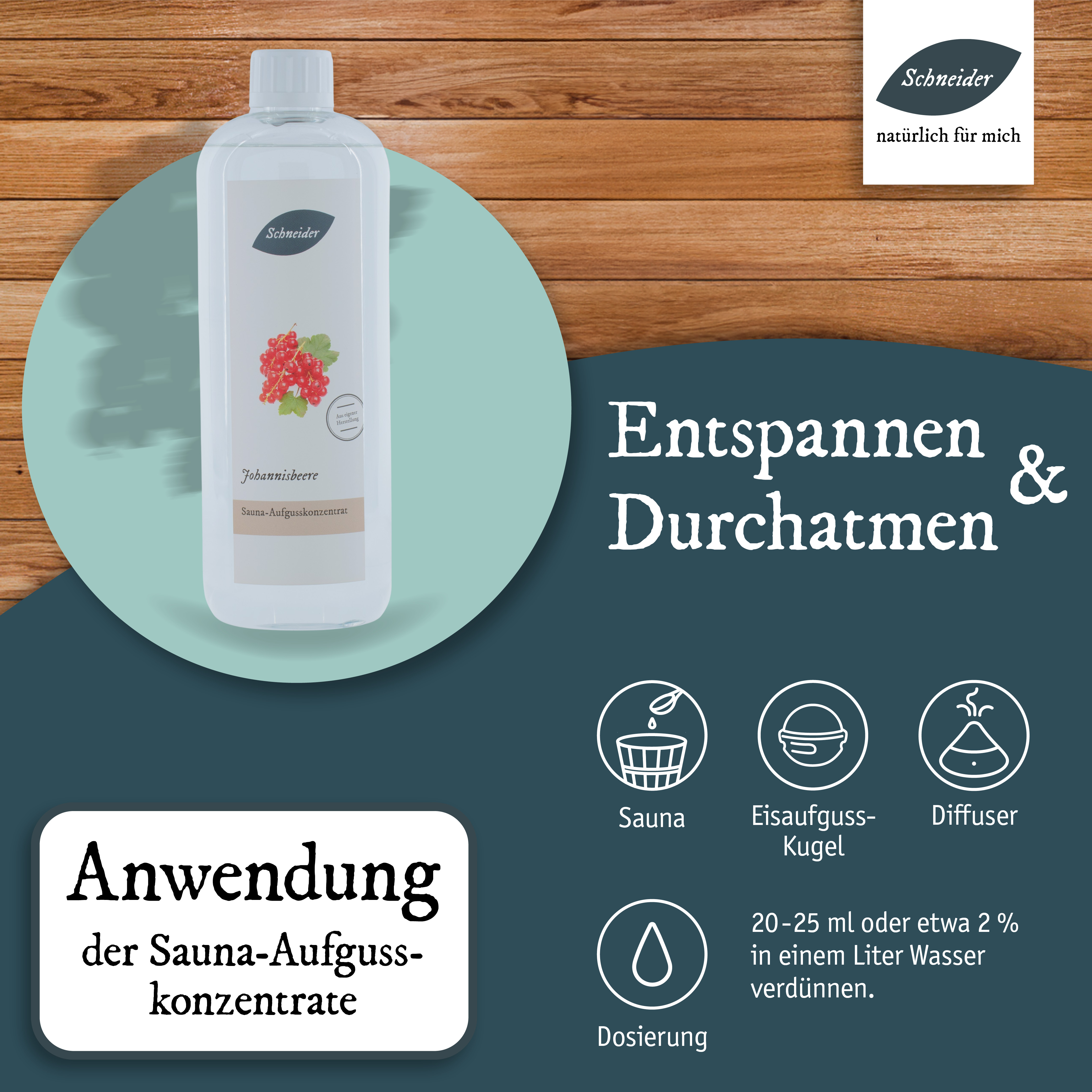 Schließen Sie die Augen und tauchen Sie ein in den süßen, frischen und leicht säuerlichen Duft von reifer Johannisbeere. Fühlen Sie sich in Ihrer Sauna an einen herrlichen Sommertag erinnert. Der Saunaaufguss Johannisbeere nach eigener Rezeptur verspricht Entspannung pur – ein Must-have für jeden Saunaliebhaber!