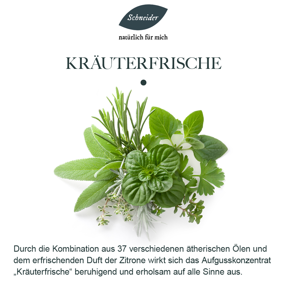 Fühlen Sie sich wie in den Bergen und atmen Sie die frische Luft der Alpen ein. Genießen Sie den tollen Duft von Alpenkräuteröl – ein Zusammenspiel aus 37 verschiedenen ätherischen Ölen – gepaart mit der fruchtigen Spritzigkeit von Zitrone. Der Saunaaufguss Kräuterfrische aus naturreinen Ölen nach eigener Rezeptur lässt Sie Zeit und Raum vergessen. Anwendung: Die Dosierung der Aufgüsse kann abhängig sein von der Größe der Sauna, der Leistung der Heizelemente, den Vorlieben der Anwender und der Intensität der einzelnen Inhaltsstoffe (wie ätherischen Ölen, Ölgemischen oder Duftölen). Als Richtwert empfehlen wir ein bis zwei Esslöffel voll Aufgusskonzentrat oder 20 bis 25 ml Aufgusskonzentrat pro Liter Aufgusswasser. Je nach Belieben können Sie die Dosierung anpassen. Saunaaufgusskonzentrate sind sparsam zu verwenden und sollten nie pur auf die Aufgusssteine oder Heizelemente gegeben werden.