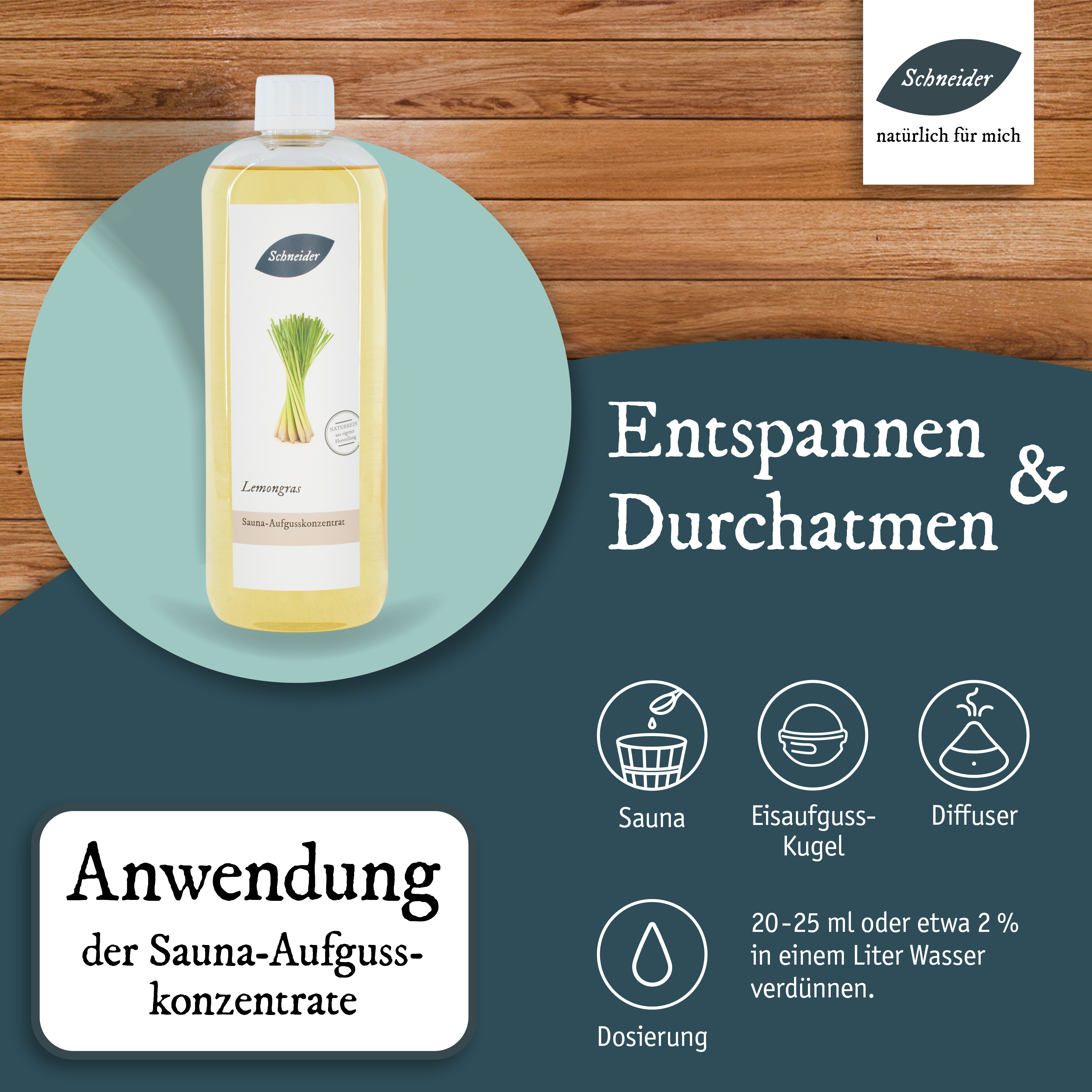 Wellness für die Seele bietet der Saunaaufguss Lemongras aus eigener Herstellung. Erleben Sie den erfrischenden, belebenden Duft von ätherischem Lemongrasöl, das die Konzentration fördern und den Geist vitalisieren kann. Auch aufgrund der anregenden Zitrus-Noten einer der beliebtesten Saunaaufgüsse. Anwendung: Die Dosierung der Aufgüsse kann abhängig sein von der Größe der Sauna, der Leistung der Heizelemente, den Vorlieben der Anwender und der Intensität der einzelnen Inhaltsstoffe (wie ätherischen Ölen, Ölgemischen oder Duftölen). Als Richtwert empfehlen wir ein bis zwei Esslöffel voll Aufgusskonzentrat oder 20 bis 25 ml Aufgusskonzentrat pro Liter Aufgusswasser. Je nach Belieben können Sie die Dosierung anpassen. Saunaaufgusskonzentrate sind sparsam zu verwenden und sollten nie pur auf die Aufgusssteine oder Heizelemente gegeben werden.