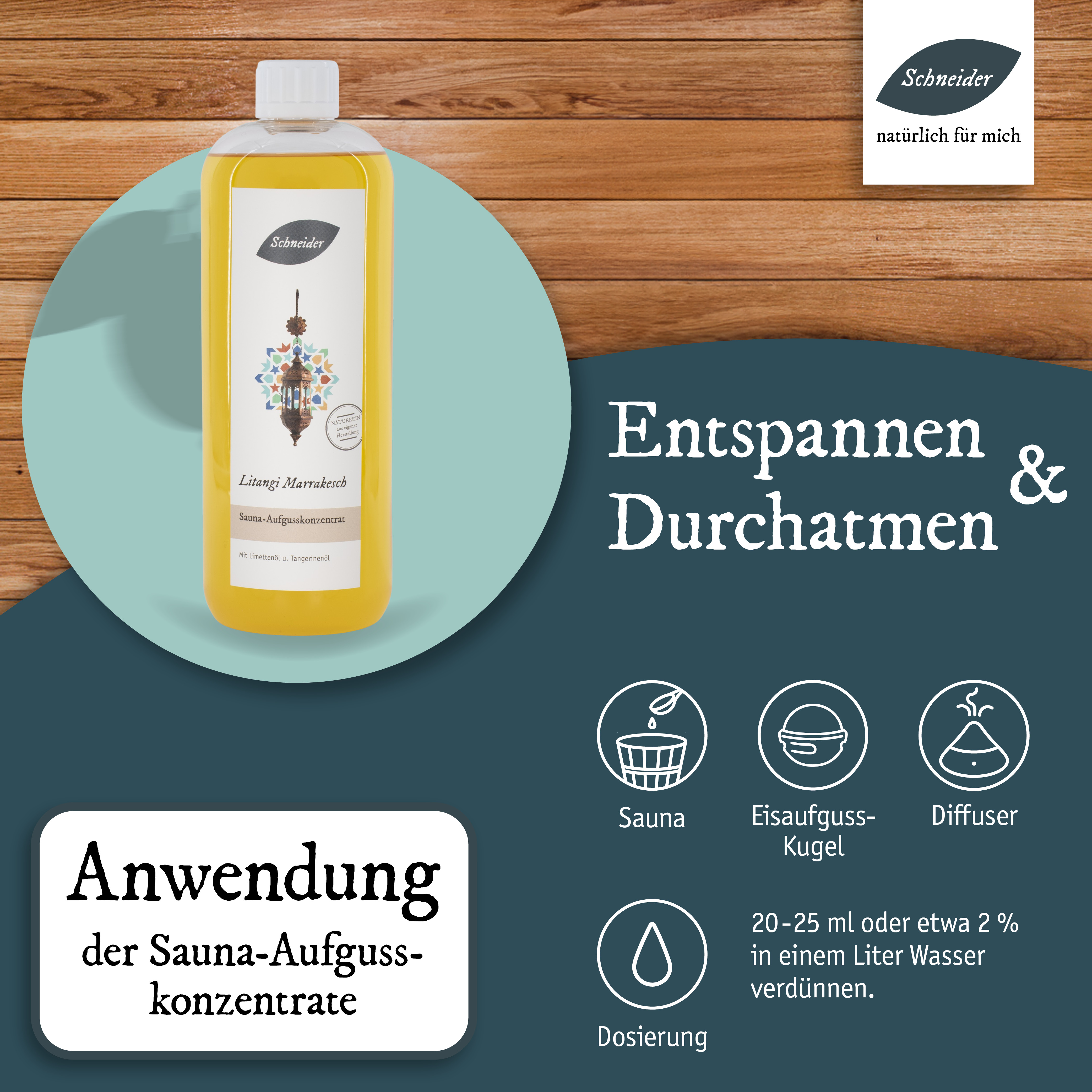 Anwendung: Die Dosierung der Aufgüsse kann abhängig sein von der Größe der Sauna, der Leistung der Heizelemente, den Vorlieben der Anwender und der Intensität der einzelnen Inhaltsstoffe (wie ätherischen Ölen, Ölgemischen oder Duftölen). Als Richtwert empfehlen wir ein bis zwei Esslöffel voll Aufgusskonzentrat oder 20 bis 25 ml Aufgusskonzentrat pro Liter Aufgusswasser. Je nach Belieben können Sie die Dosierung anpassen. Saunaaufgusskonzentrate sind sparsam zu verwenden und sollten nie pur auf die Aufgusssteine oder Heizelemente gegeben werden.