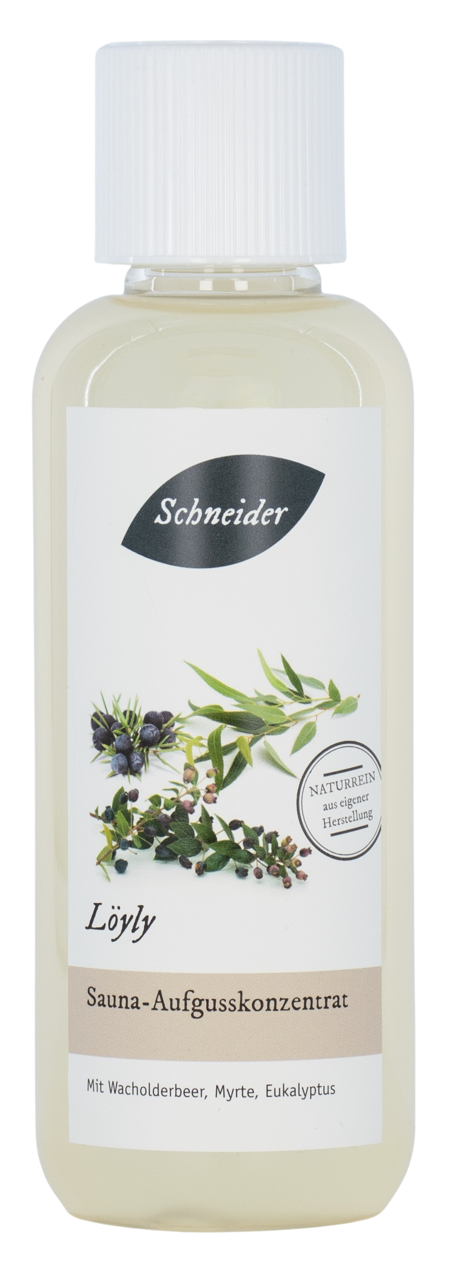 Löyly: intensiver, facettenreicher Saunaaufguss aus eigener Herstellung mit Zitrone, Myrte, Zedernholz, Eukalyptus, jap. Pfefferminz und Wachholderbeer