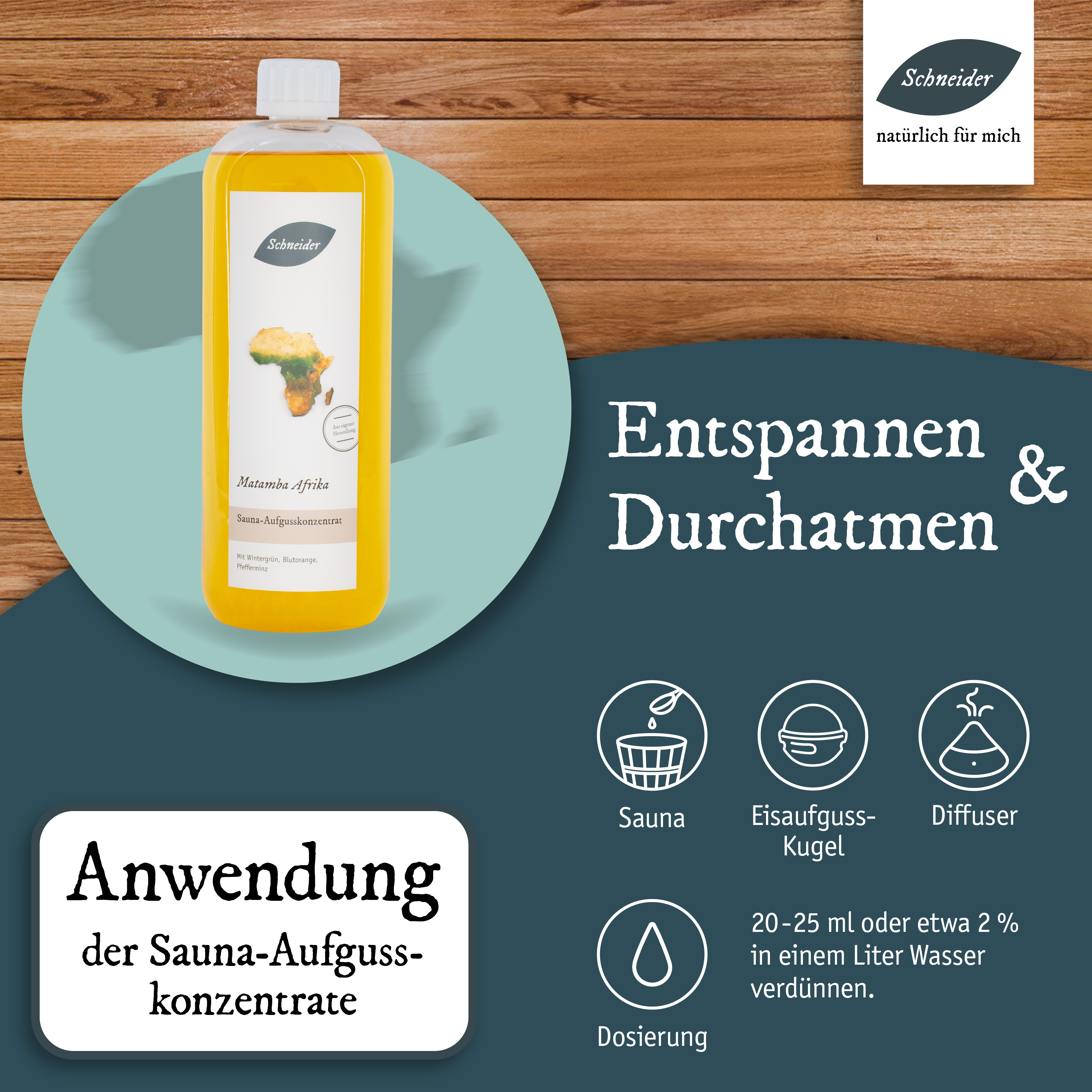 Genießen Sie diesen einzigartigen Saunaaufguss mit allen Sinnen! Nach eigener Rezeptur hergestellt, begeistert er mit einer Kombination aus frischen, grünen, minzigen und fruchtigen Duftnoten. Seinen Namen hat der Saunaaufguss vom ehemaligen Königreich Matamba in Afrika, das sich lange erfolgreich gegen die Kolonialisierung wehrte und somit als Symbol für Freiheit, Gleichheit und Stärke steht. Anwendung: Die Dosierung der Aufgüsse kann abhängig sein von der Größe der Sauna, der Leistung der Heizelemente, den Vorlieben der Anwender und der Intensität der einzelnen Inhaltsstoffe (wie ätherischen Ölen, Ölgemischen oder Duftölen). Als Richtwert empfehlen wir ein bis zwei Esslöffel voll Aufgusskonzentrat oder 20 bis 25 ml Aufgusskonzentrat pro Liter Aufgusswasser. Je nach Belieben können Sie die Dosierung anpassen. Saunaaufgusskonzentrate sind sparsam zu verwenden und sollten nie pur auf die Aufgusssteine oder Heizelemente gegeben werden.
