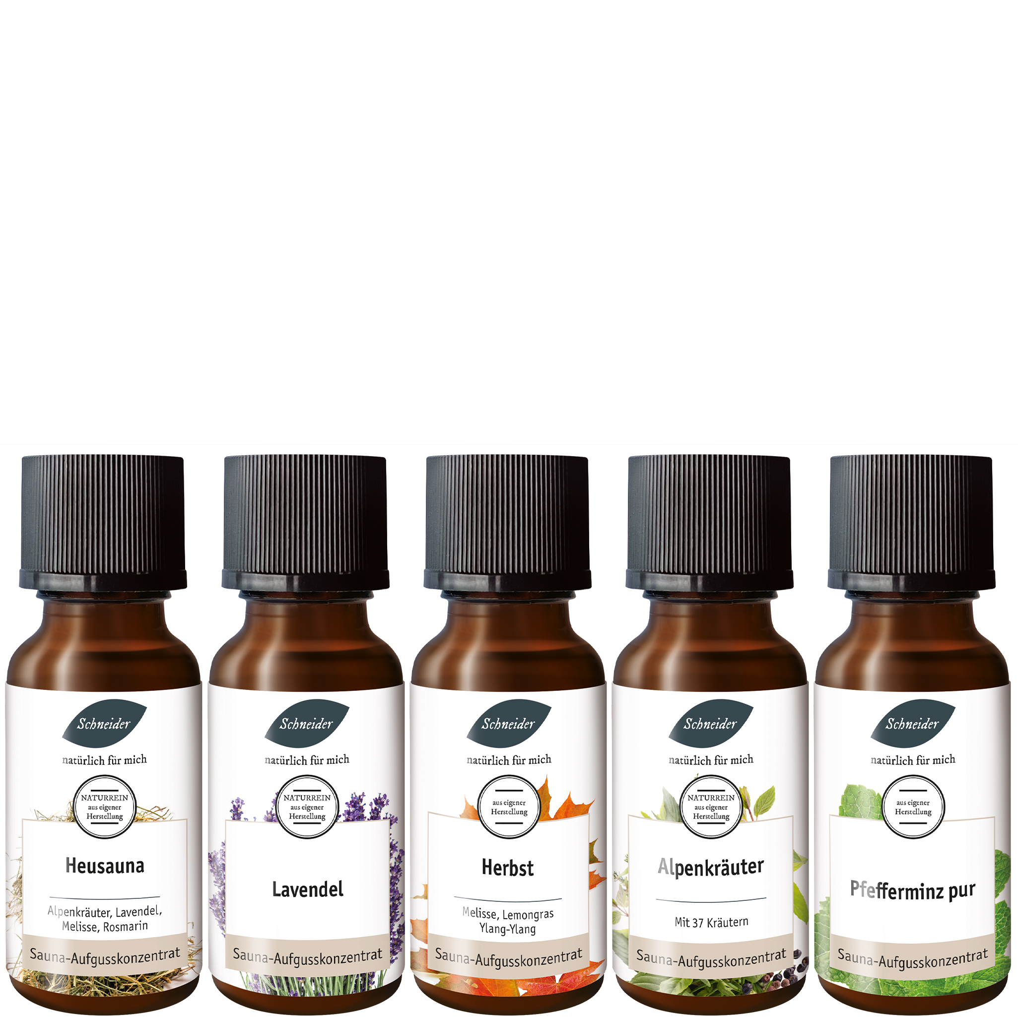 20 ml Heusauna, 20 ml Lavendel, 20 ml Herbst, 20 ml Alpenkräuter, 20 ml Pfefferminze