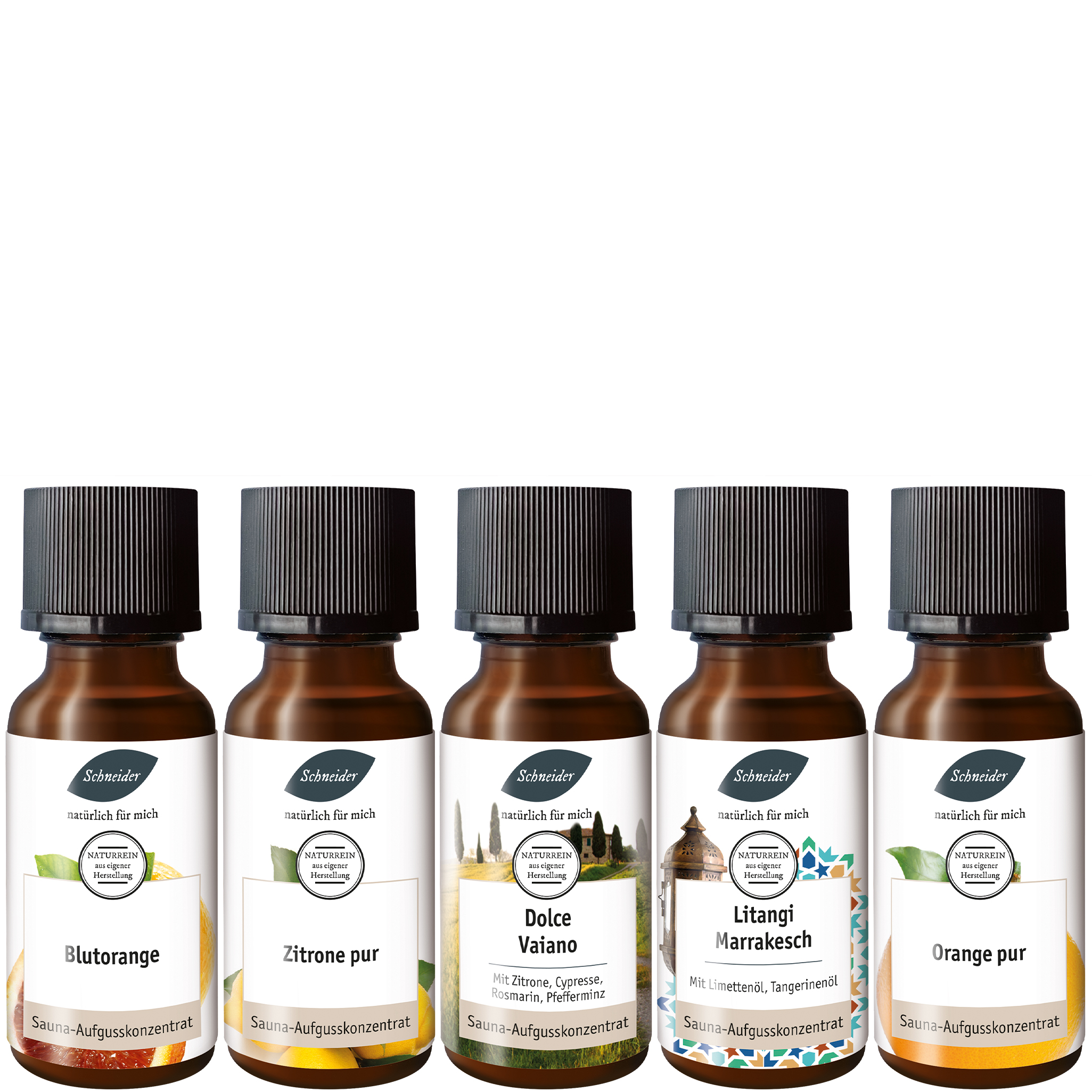 20 ml Blutorange, 20 ml Zitrone, 20 ml Litangi-Marrakesch, 20 ml Dolce-Vaiano, 20 ml Orange pur
