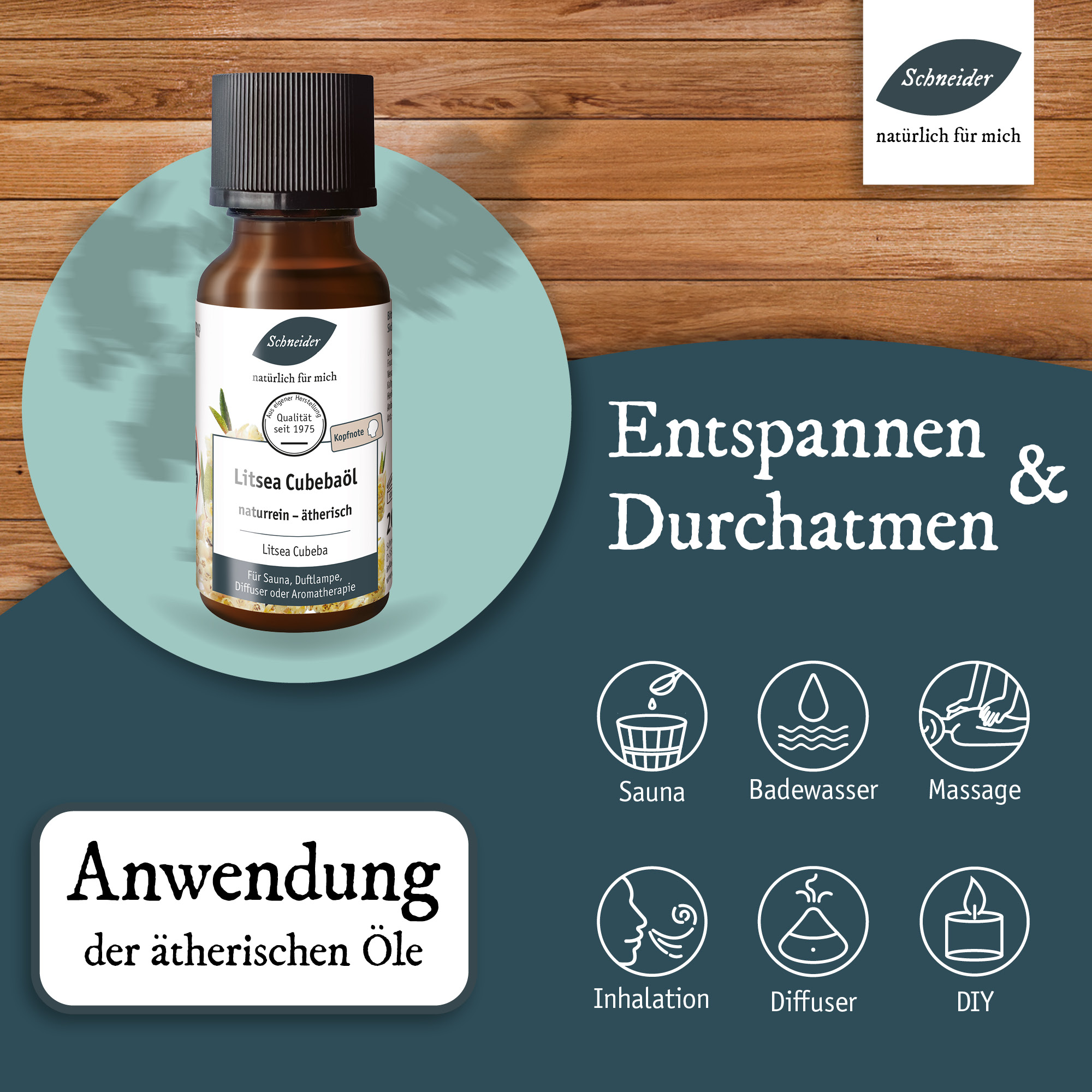 Anwendung: wenige Tropfen in Massageöl, in das Badewasser oder die Duftlampe, besonders beliebt in der Sauna