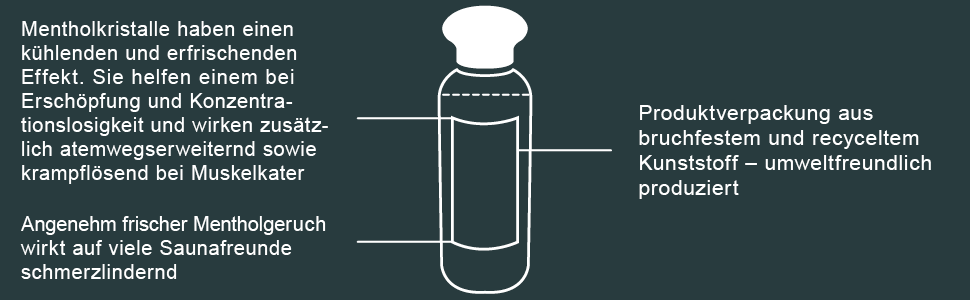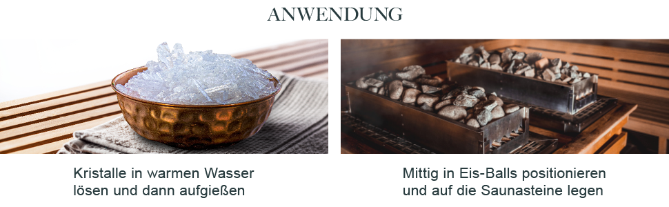 Dosierung - zur Anwendung als Saunaaufgussmittel: Je nach Saunagröße unterschiedlich und sparsam dosieren. Starten Sie zunächst mit einem Mentholkristall. Erhöhen Sie die Dosis nach Belieben, um die Intensität zu steigern. Wir empfehlen die Kristalle in warmen Wasser zu lösen und dann aufzugießen oder mittig in Eis-Balls zu positionieren und auf die Saunasteine zu legen. Nicht pur auf die Steine geben, dies kann zu Verpuffungen führen!