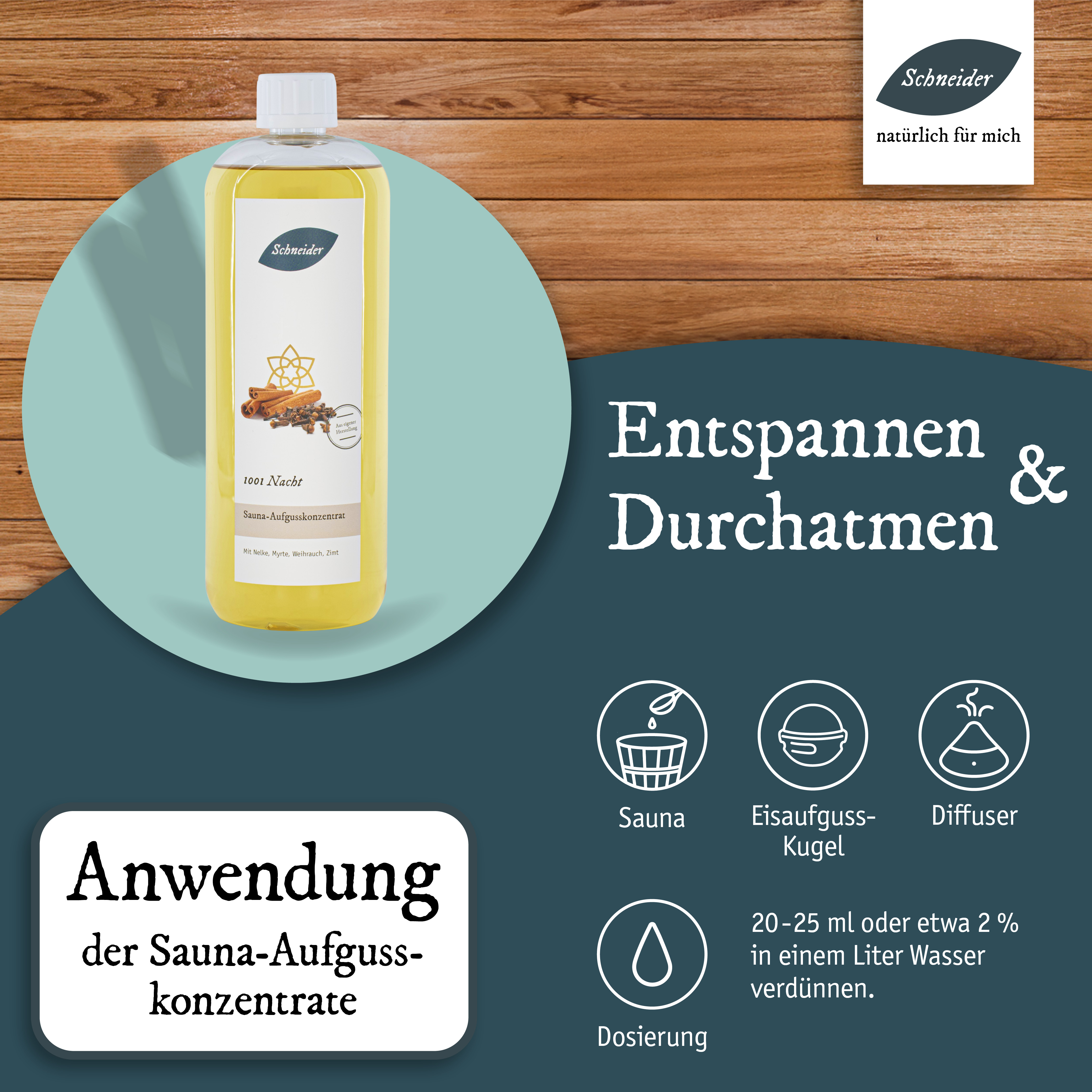 Fühlen Sie sich wie im Orient und tauchen Sie ein in die Welt von 1001 Nacht! Ein ganzes Potpourri an Düften erwartet Sie beim Saunaaufguss 1001 Nacht aus eigener Herstellung. Lassen Sie sich verwöhnen von der entspannenden Wirkung der ätherischen Öle und dem Zusammenspiel von süßlich-fruchtigen Noten mit erdig-holzigen Tönen.