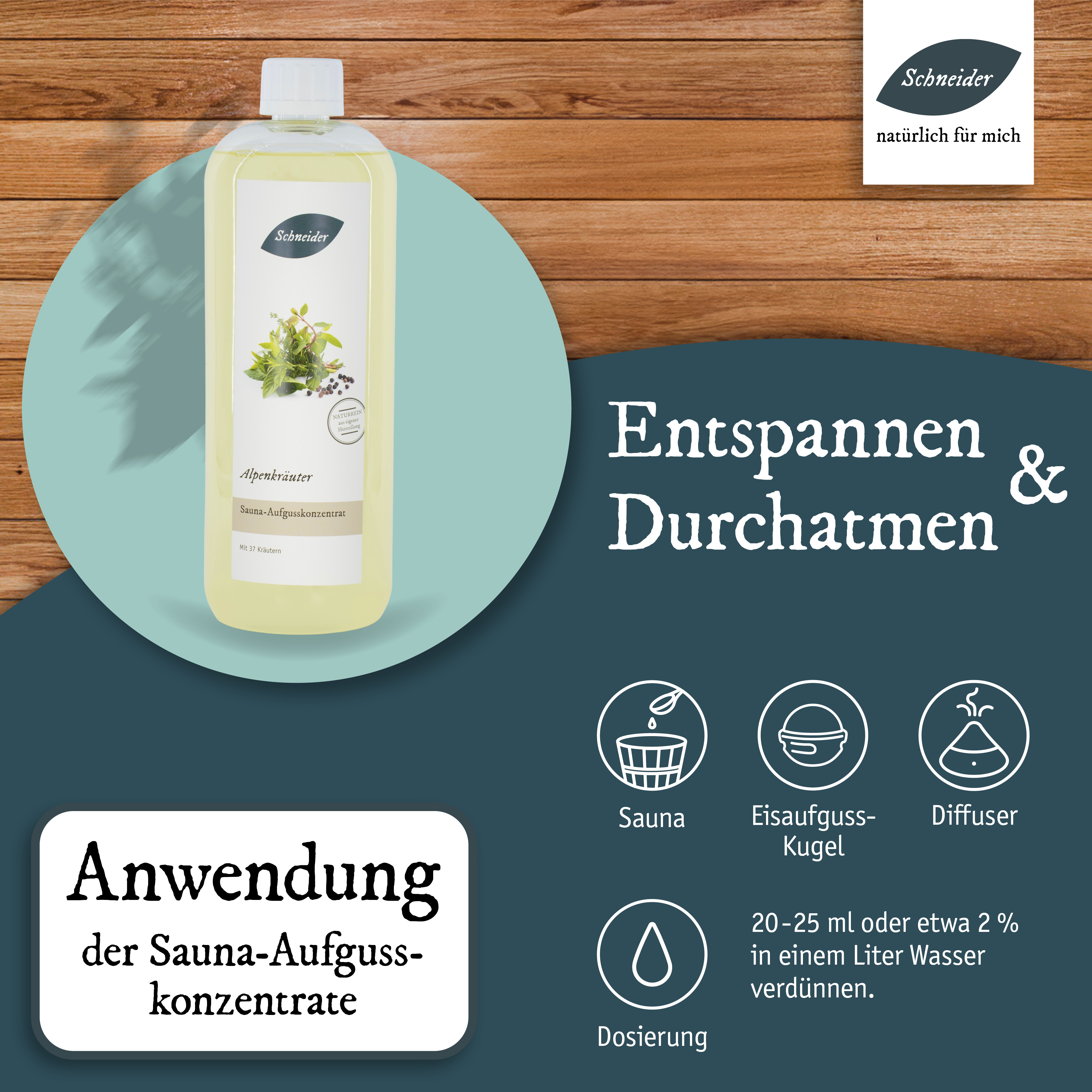 Alpenkräuter: kraftvoller, vielfältiger Saunaaufguss mit verschiedenen Alpenkräutern; aus natürlichen Ölen und eigener Herstellung