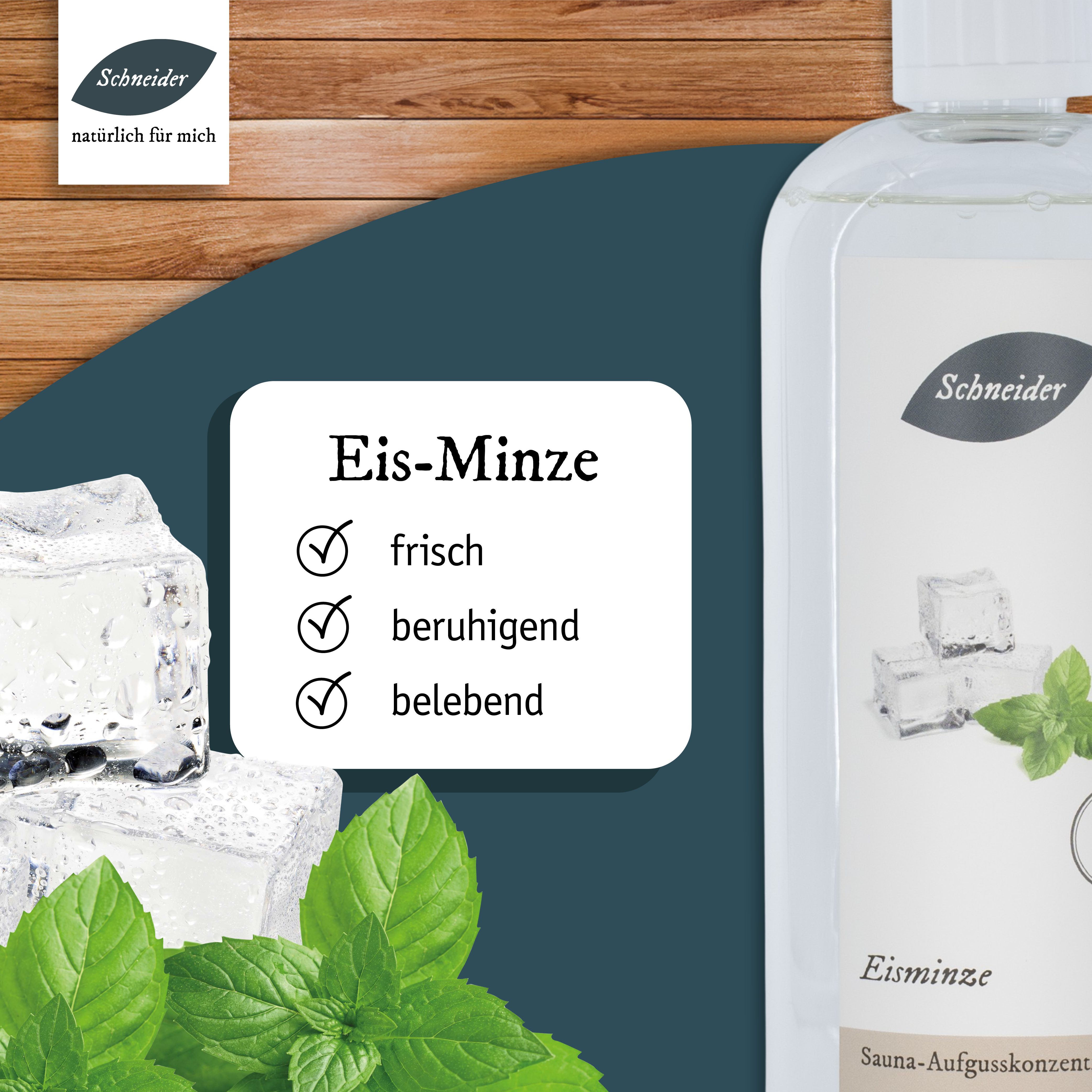 Eis-Minze: anregend-frischer Saunaaufguss aus eigener Herstellung mit Pfefferminze, Gletschereis und Menthol