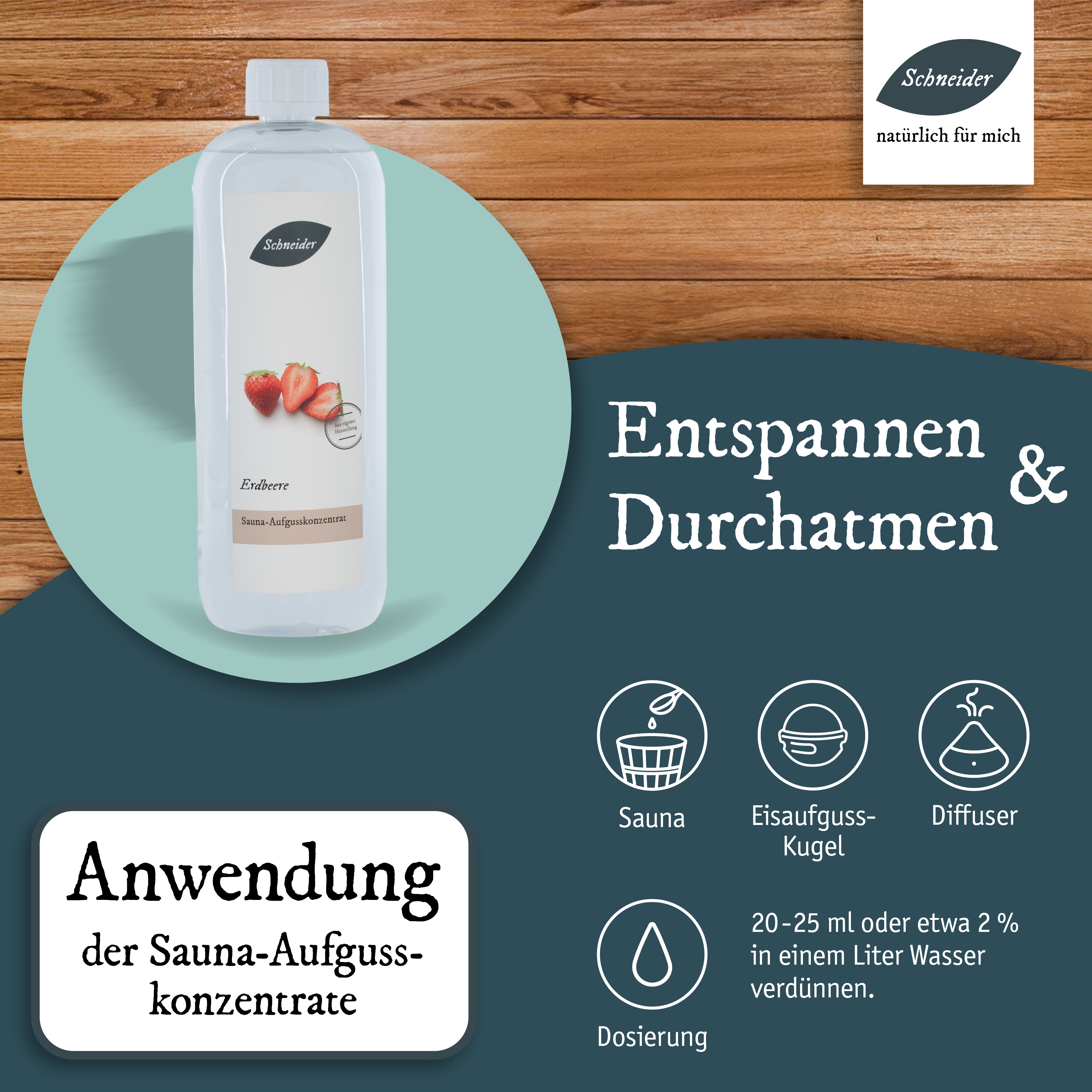 Erleben Sie besondere Momente mit dem nach eigener Rezeptur hergestellten Saunaaufguss Erdbeere. Lassen Sie sich vom saftig-süßen Duft reifer Erdbeeren in Kombination mit der angenehmen Frische von Menthol verführen. Das verspricht Entspannung pur! Der Genuss von frischen Erdbeeren nach dem Aufguss macht das Erlebnis perfekt! Anwendung: Die Dosierung der Aufgüsse kann abhängig sein von der Größe der Sauna, der Leistung der Heizelemente, den Vorlieben der Anwender und der Intensität der einzelnen Inhaltsstoffe (wie ätherischen Ölen, Ölgemischen oder Duftölen). Als Richtwert empfehlen wir ein bis zwei Esslöffel voll Aufgusskonzentrat oder 20 bis 25 ml Aufgusskonzentrat pro Liter Aufgusswasser. Je nach Belieben können Sie die Dosierung anpassen. Saunaaufgusskonzentrate sind sparsam zu verwenden und sollten nie pur auf die Aufgusssteine oder Heizelemente gegeben werden.