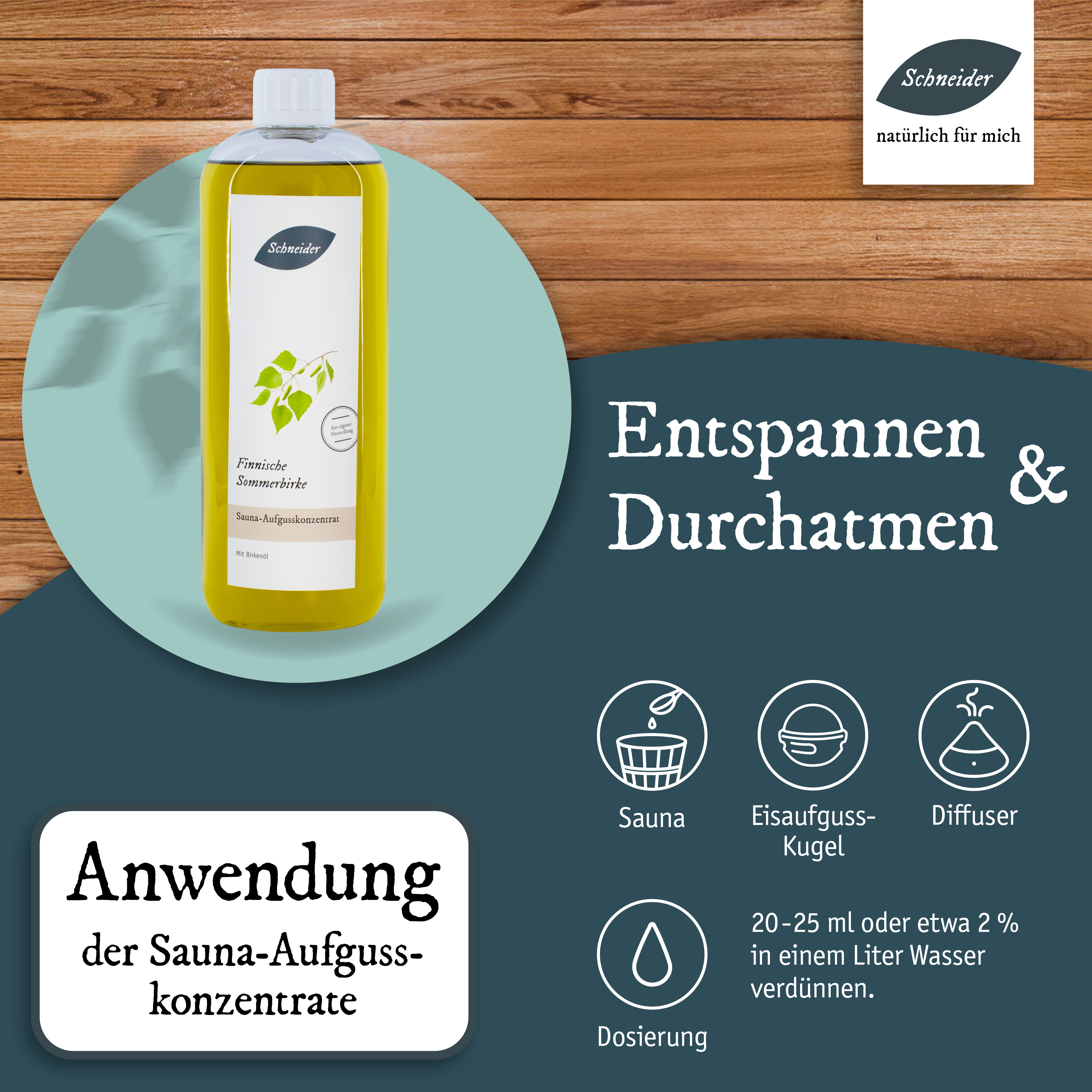 Genießen Sie den anregenden Duft frischer Birkenblätter. Spüren Sie die ausgleichende und harmonisierende Wirkung des nach eigener Rezeptur hergestellten Saunaaufgusses Finnische Sommerbirke und schwelgen Sie in dessen lieblich-sanfter, leicht seifiger Art. Ein beliebter Klassiker unter unseren Saunaaufgüssen! Anwendung: Die Dosierung der Aufgüsse kann abhängig sein von der Größe der Sauna, der Leistung der Heizelemente, den Vorlieben der Anwender und der Intensität der einzelnen Inhaltsstoffe (wie ätherischen Ölen, Ölgemischen oder Duftölen). Als Richtwert empfehlen wir ein bis zwei Esslöffel voll Aufgusskonzentrat oder 20 bis 25 ml Aufgusskonzentrat pro Liter Aufgusswasser. Je nach Belieben können Sie die Dosierung anpassen. Saunaaufgusskonzentrate sind sparsam zu verwenden und sollten nie pur auf die Aufgusssteine oder Heizelemente gegeben werden.