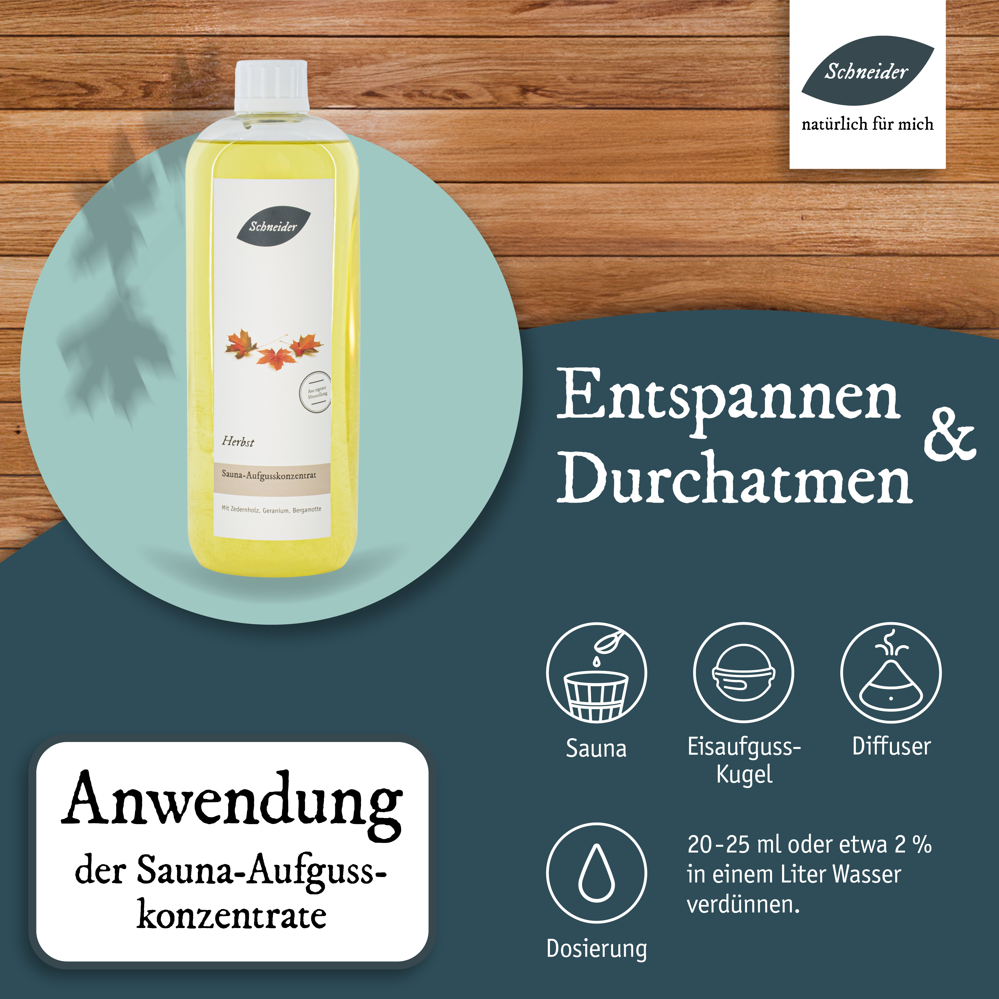 Herbst – das Zusammenspiel von Aromen und Farben! Dieses spiegelt sich auch in dem nach eigener Rezeptur hergestellten Saunaaufguss Herbst wider. Da gibt es die fruchtig-frische Komponente von Orangen, Zitronen und Bergamotte, untermalt von blumigen Noten von Geranium und abgerundet von der warmen, erdig-harzigen Art von Zedernholz. Alles fügt sich zu einem runden Ganzen zusammen – für eine perfekte Erholung! Anwendung: Die Dosierung der Aufgüsse kann abhängig sein von der Größe der Sauna, der Leistung der Heizelemente, den Vorlieben der Anwender und der Intensität der einzelnen Inhaltsstoffe (wie ätherischen Ölen, Ölgemischen oder Duftölen). Als Richtwert empfehlen wir ein bis zwei Esslöffel voll Aufgusskonzentrat oder 20 bis 25 ml Aufgusskonzentrat pro Liter Aufgusswasser. Je nach Belieben können Sie die Dosierung anpassen. Saunaaufgusskonzentrate sind sparsam zu verwenden und sollten nie pur auf die Aufgusssteine oder Heizelemente gegeben werden.