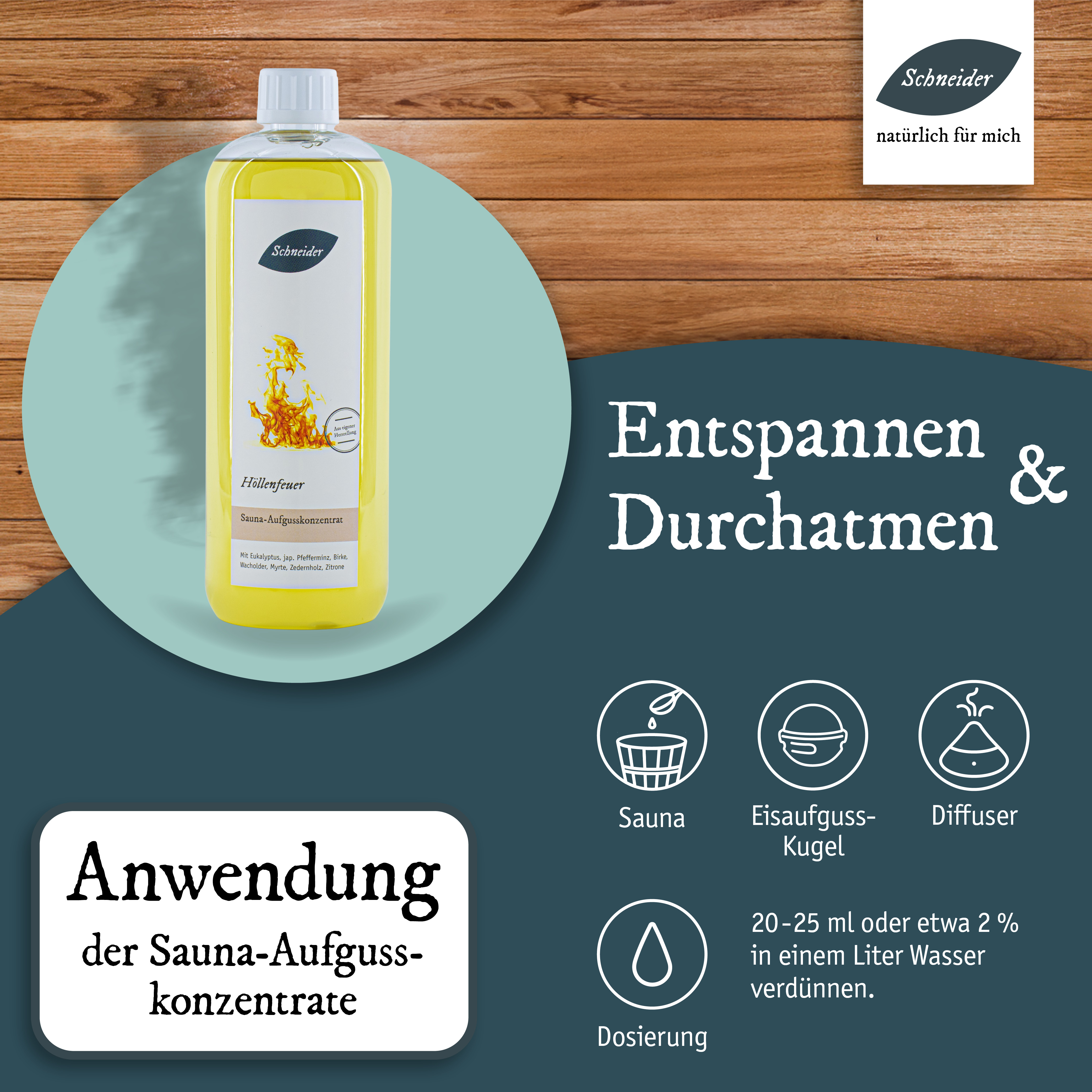 Beim Saunaaufguss Höllenfeuer aus eigener Herstellung ist der Name Programm! Das einzigartige Zusammenspiel aus sieben verschiedenen Ölen macht ihn zu einem absoluten Highlight im Bereich der Saunaaufgüsse. Wer richtig schwitzen will, wer das Feuer sucht, liegt hier absolut richtig! Anwendung: Die Dosierung der Aufgüsse kann abhängig sein von der Größe der Sauna, der Leistung der Heizelemente, den Vorlieben der Anwender und der Intensität der einzelnen Inhaltsstoffe (wie ätherischen Ölen, Ölgemischen oder Duftölen). Als Richtwert empfehlen wir ein bis zwei Esslöffel voll Aufgusskonzentrat oder 20 bis 25 ml Aufgusskonzentrat pro Liter Aufgusswasser. Je nach Belieben können Sie die Dosierung anpassen. Saunaaufgusskonzentrate sind sparsam zu verwenden und sollten nie pur auf die Aufgusssteine oder Heizelemente gegeben werden.