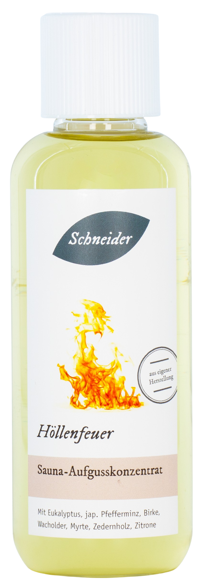 Höllenfeuer: schweißtreibender, feuriger Saunaaufguss aus eigener Herstellung mit Zitrone, Myrte, Zedernholz, Eukalyptus, japanischem Pfefferminzöl, Wachholderbeere und Birke