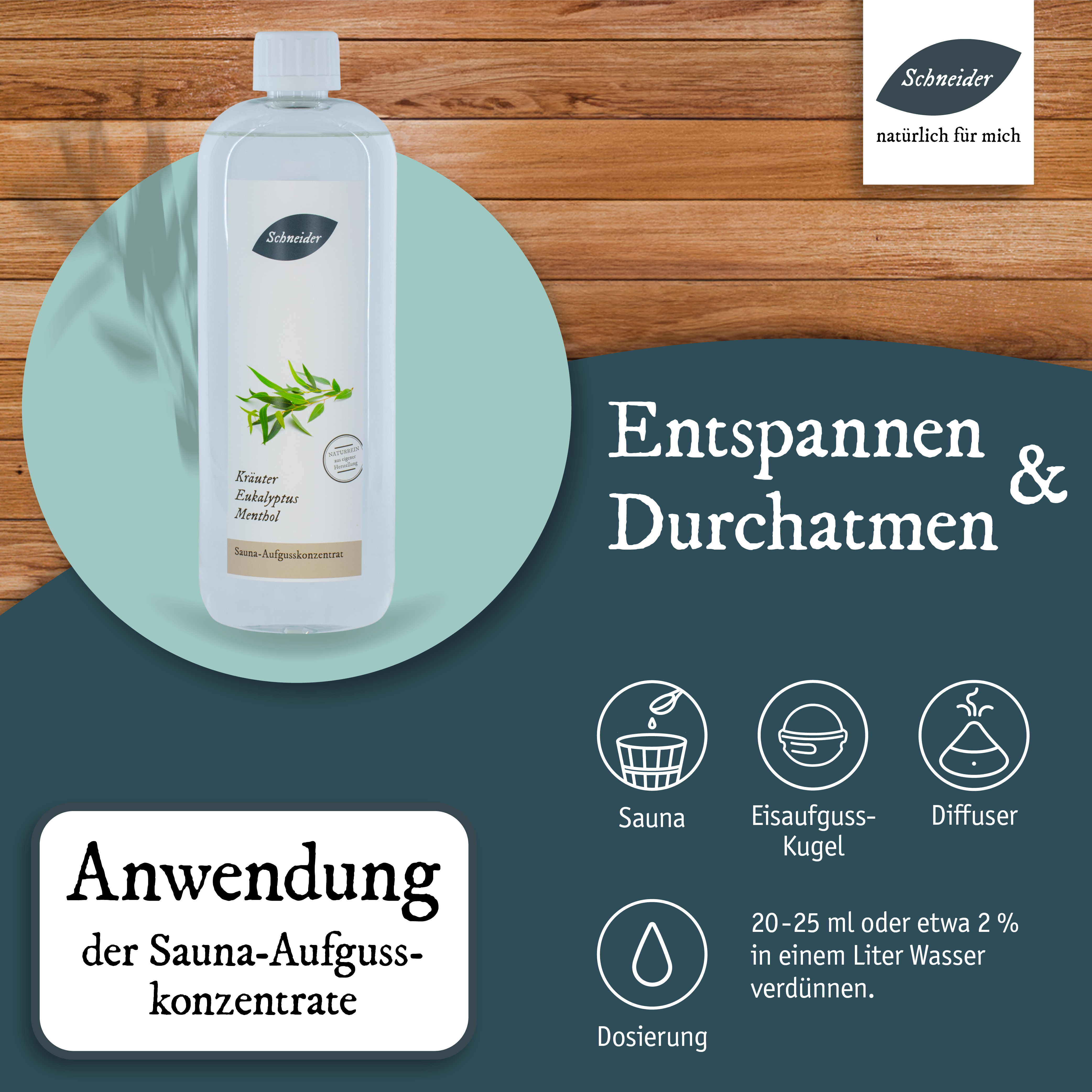Der „Klassiker“ unter den Saunaaufgüssen! Ein rundum perfektes, ätherisches Dufterlebnis verspricht der Saunaaufguss Kräuter/Eukalyptus/Menthol nach eigener Rezeptur. Eukalyptus kann dabei atmungserweiternd wirken und tiefer durchatmen lassen. Zudem genießen Sie dank der 37 verschiedenen Alpenkräuteröle mit jedem Atemzug den Duft der Berge. Atmen Sie tief durch und fühlen Sie sich frei! Ein Must-have in jeder Sauna! Anwendung: Die Dosierung der Aufgüsse kann abhängig sein von der Größe der Sauna, der Leistung der Heizelemente, den Vorlieben der Anwender und der Intensität der einzelnen Inhaltsstoffe (wie ätherischen Ölen, Ölgemischen oder Duftölen). Als Richtwert empfehlen wir ein bis zwei Esslöffel voll Aufgusskonzentrat oder 20 bis 25 ml Aufgusskonzentrat pro Liter Aufgusswasser. Je nach Belieben können Sie die Dosierung anpassen. Saunaaufgusskonzentrate sind sparsam zu verwenden und sollten nie pur auf die Aufgusssteine oder Heizelemente gegeben werden.