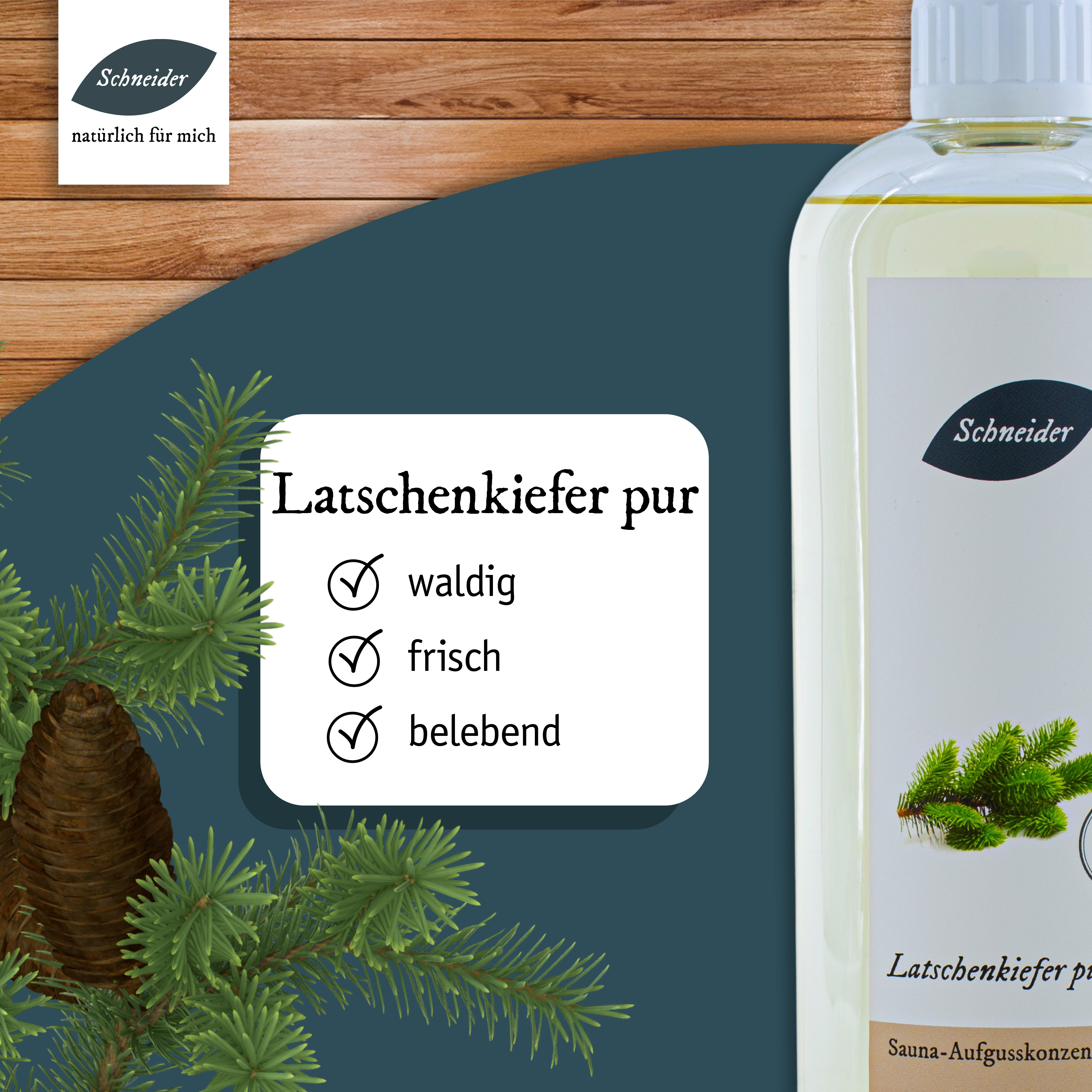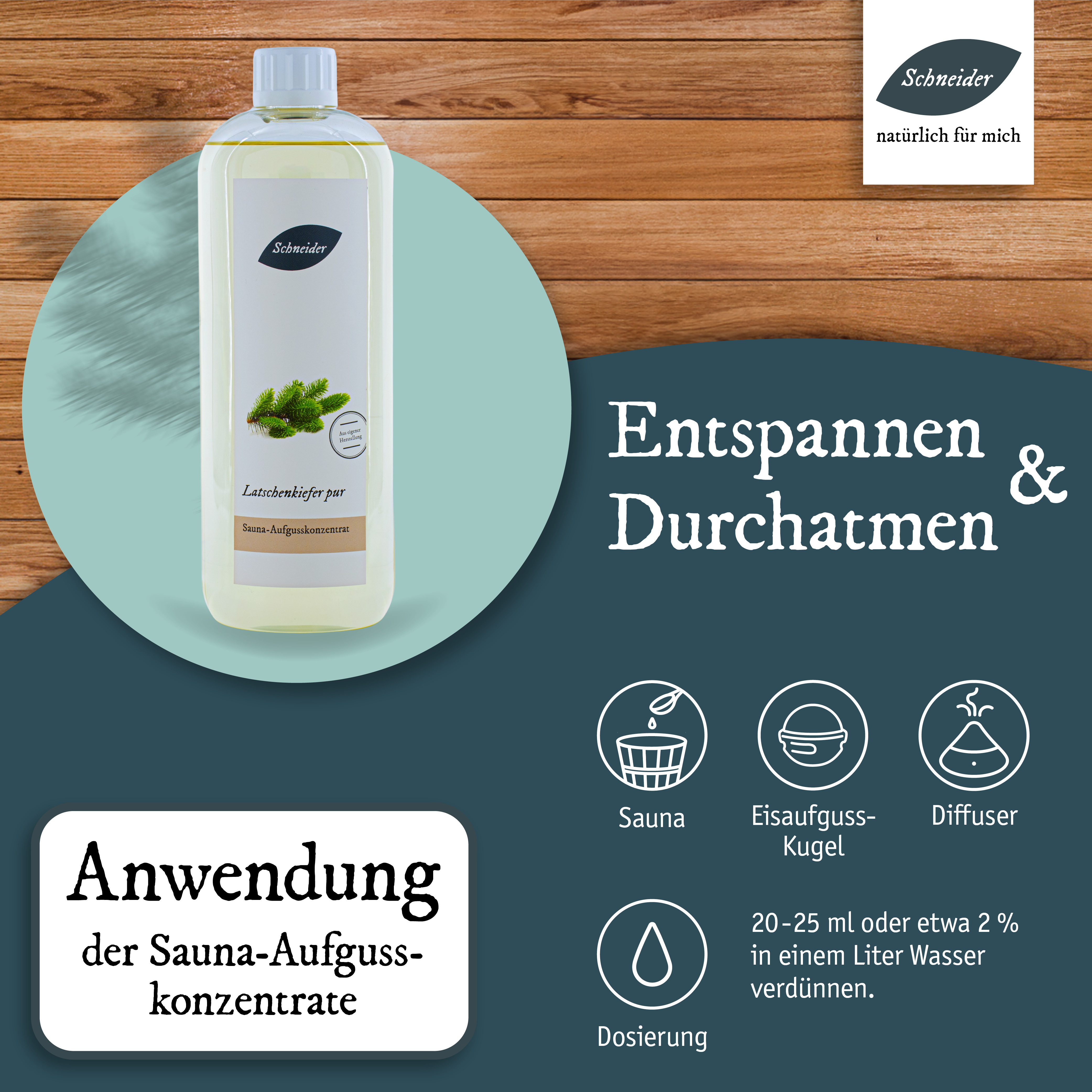Schließen Sie die Augen und atmen Sie den Duft von 100 Kiefern! Der aromatische, waldige Saunaaufguss Latschenkiefer aus eigener Herstellung kann belebend und vitalisierend wirken – wie ein Kurzurlaub im Wald. Anwendung: Die Dosierung der Aufgüsse kann abhängig sein von der Größe der Sauna, der Leistung der Heizelemente, den Vorlieben der Anwender und der Intensität der einzelnen Inhaltsstoffe (wie ätherischen Ölen, Ölgemischen oder Duftölen). Als Richtwert empfehlen wir ein bis zwei Esslöffel voll Aufgusskonzentrat oder 20 bis 25 ml Aufgusskonzentrat pro Liter Aufgusswasser. Je nach Belieben können Sie die Dosierung anpassen. Saunaaufgusskonzentrate sind sparsam zu verwenden und sollten nie pur auf die Aufgusssteine oder Heizelemente gegeben werden.