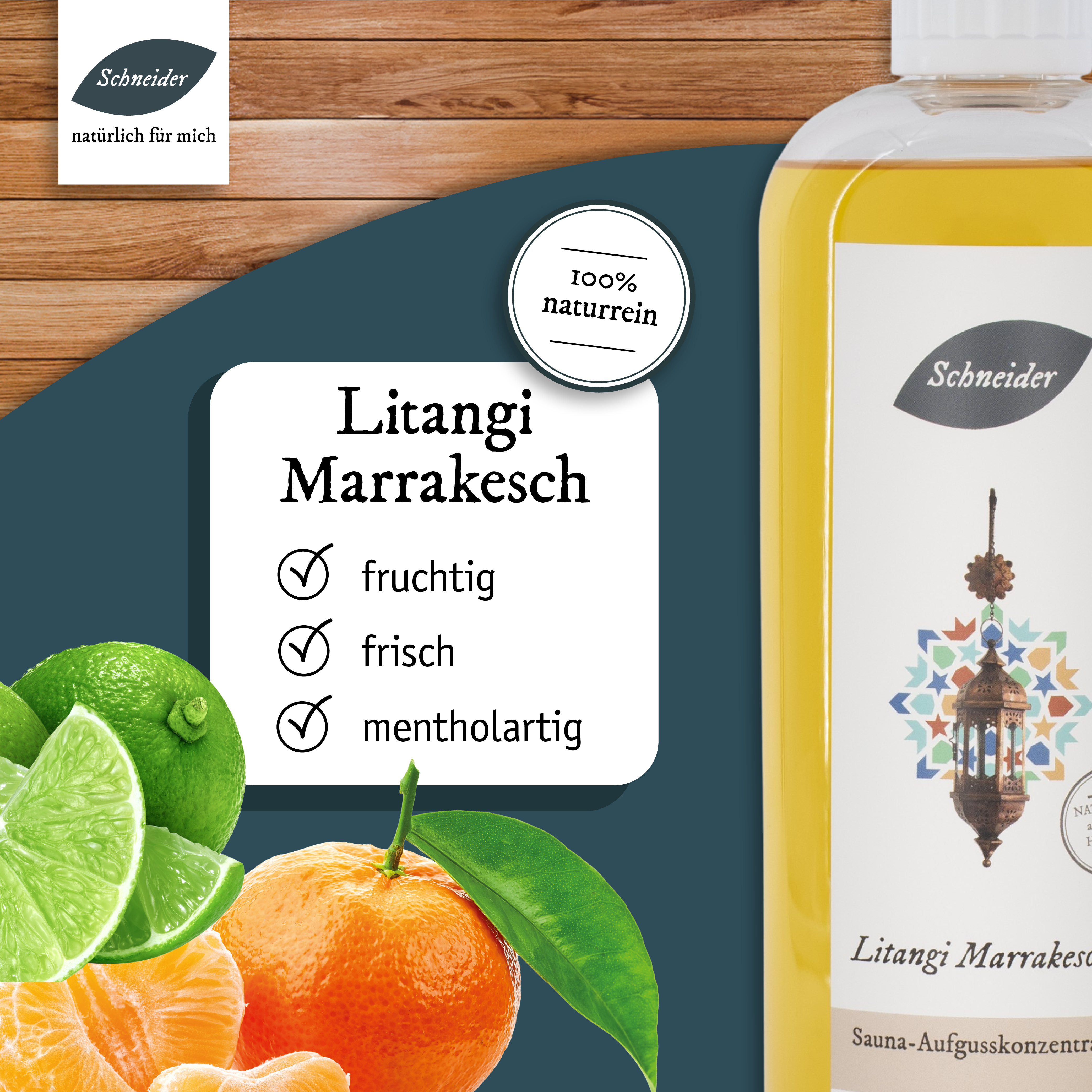 Die wärmende und fruchtige Frische des Sommers hält Einzug in Ihrer Sauna! Genießen Sie die tolle Duft-Kombination aus Limetten und Tangerinenöl des Saunaaufgusses aus eigener Herstellung. Fühlen Sie sich wie auf dem Wochenmarkt in Marrakesch. Der Duft der Öle lässt müde Geister erwachen, kann die Stimmung aufhellen und die Muskeln entspannen.