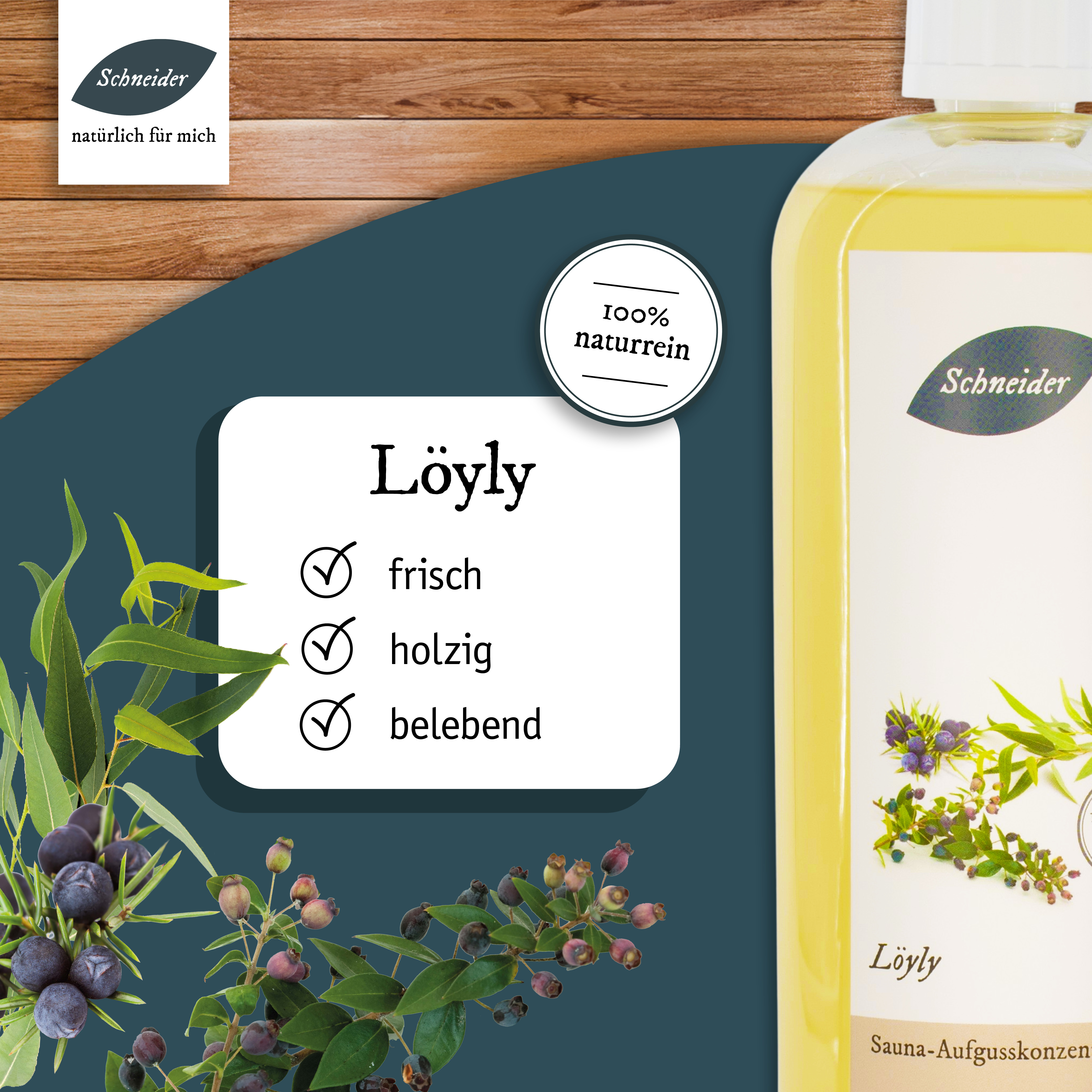 Löyly: intensiver, facettenreicher Saunaaufguss aus eigener Herstellung mit Zitrone, Myrte, Zedernholz, Eukalyptus, jap. Pfefferminz und Wachholderbeer
