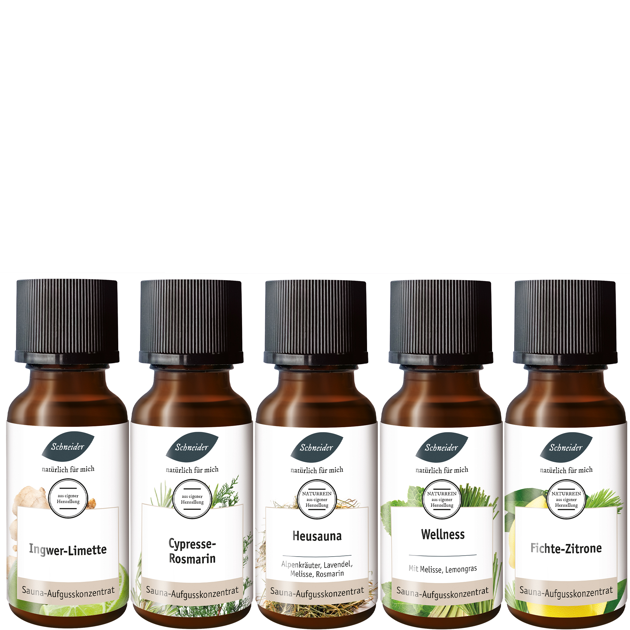 20 ml Ingwer-Limette, 20 ml Cypresse-Rosmarin, 20 ml Heusauna, 20 ml Wellness, 20 ml Fichte-Zitrone
